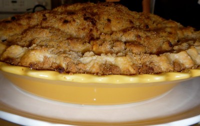 5. Bake the pie for 15 minutes, then reduce the oven temperature to 350 degrees and bake 45 minutes longer. I usually have to cover the pie with foil at some point after the first 15 minutes to keep the crumble for burning, so keep an eye on it.
