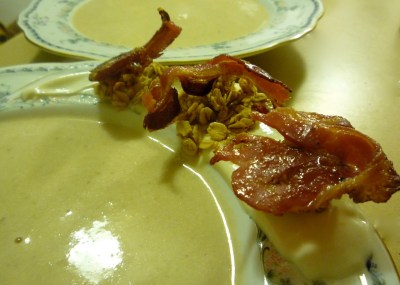 This recipe is my stab at recreating the absolutely extraordinary chestnut bisque I had at Gargoyles.  The bisque was served in a very large bowl with a wide rim.  An amaretto yogurt was smeared thickly on one third of the rim of the bowl, and three little towers of a truffled granola were piled atop the yogurt.  On top of each tower of granola was a quartered slice of candied pancetta.   To top it off, the whole bowl was set on top of a dainty branch of charred pine, so that you smelled the pine smoke while you were eating the bisque. It was so. much. fun.