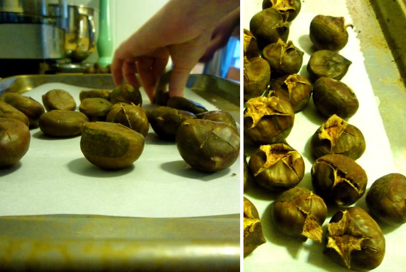 2. Roast the chestnuts.  People are always saying to slash an “X” through the chestnuts, but don’t do this! Instead, go with the Martha method of slicing almost all the way around the chestnut like you’re drawing the equator.  This will make peeling much easier! (You’ll note from the picture below that I learned this the hard way). Place them on a parchment paper lined baking sheet.  Add the two shiitake caps to the same baking sheet, drizzle the shiitakes with olive oil and sprinkle lightly with kosher salt. Put the baking sheet in the oven and roast for 20 minutes.