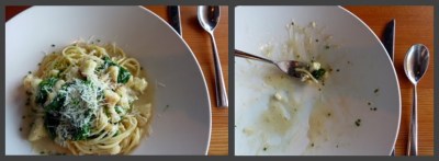 Helen got the simply named Spaghetti, which came with roasted cauliflower, spinach, and an almost carbonara-like sauce with pecorino. It was fantastic (as you can no doubt tell for yourself by her ‘after’ shot). The cauliflower made the whole dish feel rich and satisfying, but not at all heavy. Helen said she felt pleasantly full after finishing it.