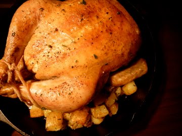 5. Remove the chicken from the oven, and put on a cutting board. Toss the fresh thyme into the skillet, and mix it in so it coats the potatoes. Tilt the skillet so that your chicken fat/thyme liquid runs to the side, and spoon some of this over the chicken, so that the bird becomes shiny with chicken fat and flecked with thyme. Allow the bird to rest for 10 minutes, then devour, along with those schmaltz-y potatoes.  Ooohh- also, TK recommends that you serve this with a good dijon mustard and/or butter to slather on the chicken when you’re eating it.  These are both lovely and delicious suggestions.