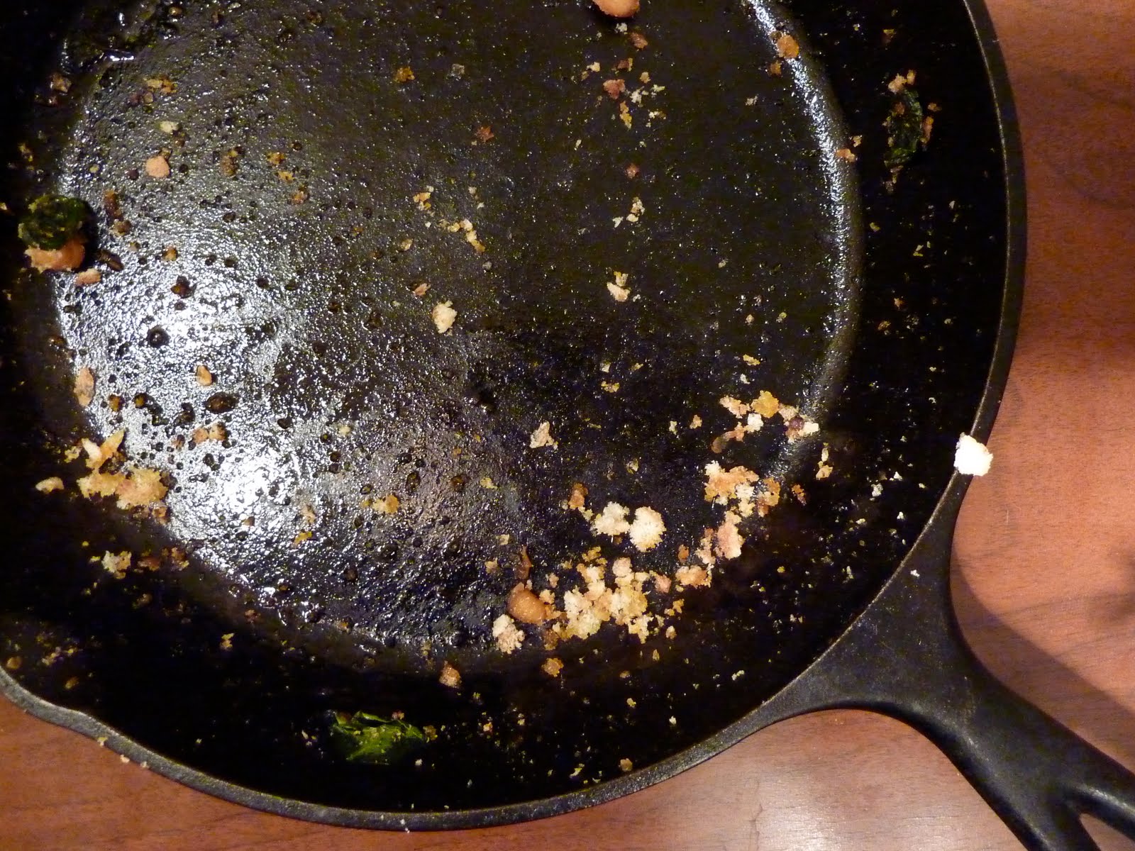 - Add the remainder of the 1/4 cup of oil to the pan; when it’s hot, add spinach and sherry, sprinkle with salt and pepper, and cook spinach over medium-low heat until very soft and the liquid has evaporated. Add chickpeas and chorizo back to the pan and toss quickly to combine; top with bread crumbs, drizzle with a bit more oil and run pan under the broiler to lightly brown the top. Serve hot or at room temperature.