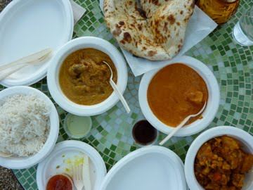 Helen and I dropped in a few days ago, and friends, it was just perfect.  Helen nailed it when, after our dinner, she said that it was the perfect blend of Austin and Indian food.  So true.  You can see in both pictures above that the dining area is flanked by an awesome bicycle-powered 80 foot snake.  There’s also a giant praying mantis closer to the truck.  Why? I have no idea.  But they, combined with the gypsy-like curtained pavilion and dreadlocked, tattooed waiters, give this place a magical, mystical Austin vibe.  And on top of that, the food is incredible.  To wit: