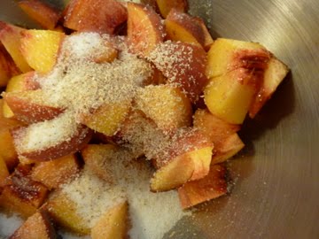 2. Cut the peaches into bite sized pieces. Toss the peaches with nutmeg and 2 tablespoons sugar. Set aside.