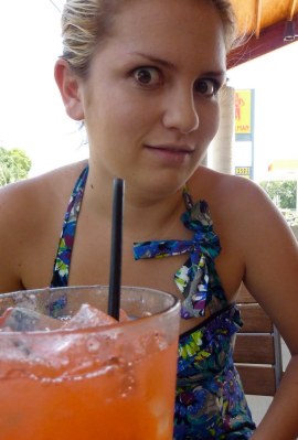 Haha! This is the sister-of-my-life doing her best crazy stalker impression as she stares adoringly at her strawberry-lemon agua fresca. It was good and pretty!