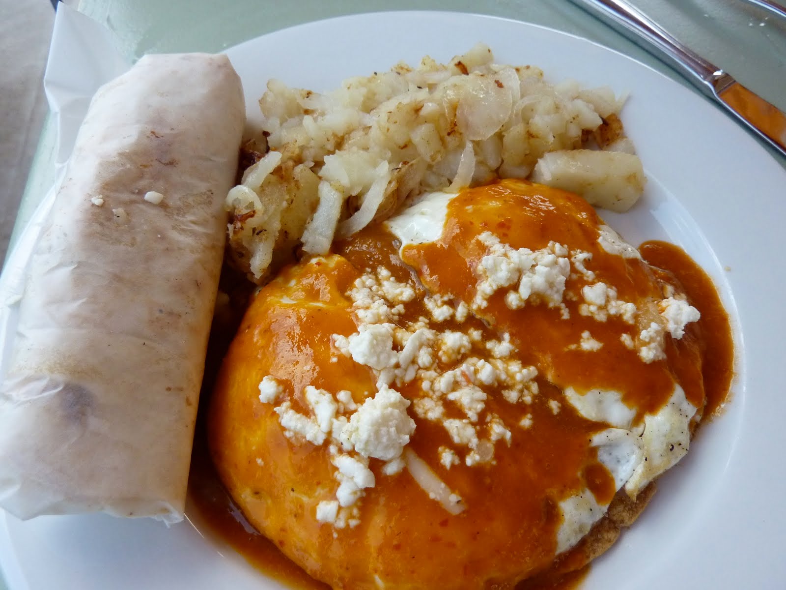 Helen’s Huevos Rancheros: tostada topped with refried beans, two fried eggs, salsa roja and queso fresco, served with breakfast potatoes and tortillas. This was also great! Fun fact about Helen: the chick’s allergic to eggs, but she hearts them so much she orders them just for the thrill of savoring one or two delicious mouthfuls, and then pushes them aside. It’s weird.
