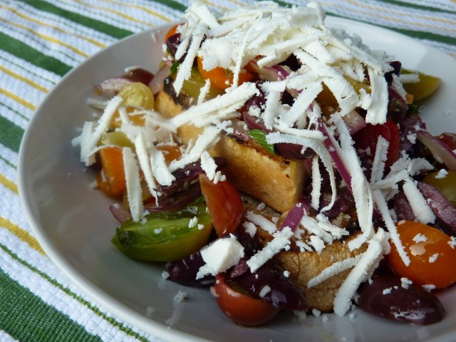Anyway, in my days before The Lumpy Dumpster was on the scene, my friend Erin and I used to eat here all the time for work lunches, and we would both always order this salad.  It just has everything going for it-sweet tomatoes, briny olives, rich olive oil-soaked bread, and salty cheese. Come on! That’s tasty.