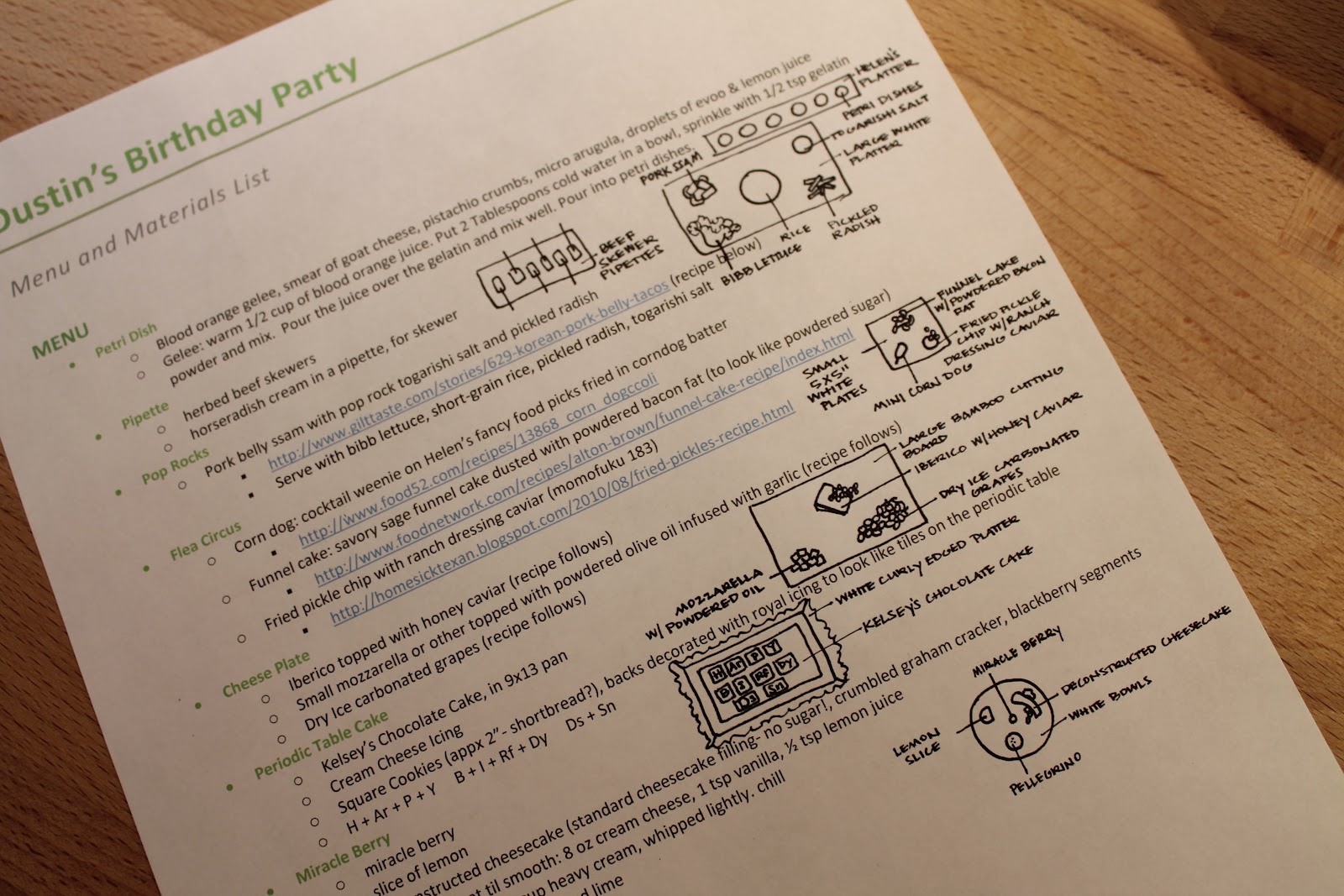 After much, much more tinkering, I finally had a working menu. To help plan, I typed up the menu with links to recipes I’d be using that I hadn’t made before. I wrote up a shopping list for items I would need, with sections for the farmers’ market and grocery store, including when the items would need to be purchased (for example, the meat I used was purchased at the farmers’ market the week before the party because it is sold frozen, so I needed lead time to defrost it). I sketched (and helenthenanny resketched- she’s a much tidier artist than me!) pictures of what the courses would look like, so I could get a sense of what equipment I would need to plate each dish, and so I could make sure I had enough serving pieces to make every course look the way I envisioned it. Lastly, I made up a bulleted to-do list for Thursday, Friday, and Saturday (the day of the party), with the bullets listing everything that needed to be done in the order I would need to do it. All this planning really helped me keep cool and stay on task during the hours of prep work. Planning the party was such fun- I can’t wait to show you how it turned out!