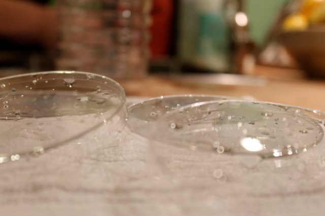 To begin planning the menu, I thought back to the dishes I’d read about or seen on television. We would definitely have a course where a pipette was used as a skewer. And fortuitously, just before we started planning the party, an episode of Top Chef aired with a quickfire challenge about modernist cooking. I remembered three dishes in particular that I thought I could emulate: a dish with powdered olive oil, another with a faux caviar that actually tasted like dill (a technique called spherification), and a Miracle Berry tasting plate (though it sounds like something you’d take at a rave, Miracle Berry is a totally legit pill that makes sour things taste sweet for an hour or two). I had ideas for four courses already! Through random googling, I came across jello shots in petri dishes. But this was a classy party, a gougères-on-shiny-platters-party, so I would make a savory gelée instead- perhaps inspired by an item on the