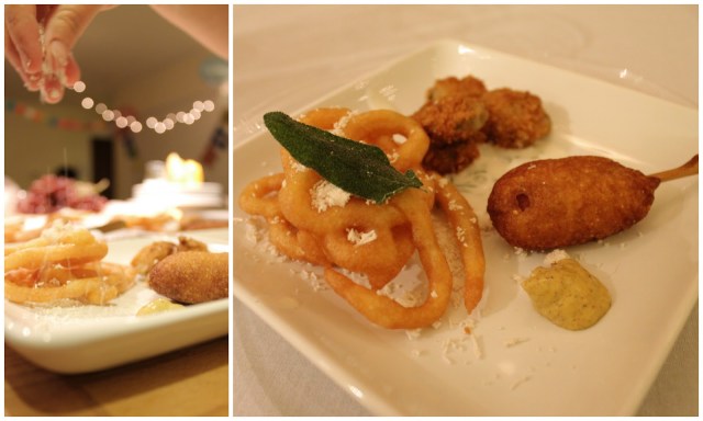 The fourth course: Flea Circus.  Miniature corn dog with spicy mustard, fried pickles with homemade buttermilk ranch, and funnel cake with sage and powdered bacon fat. The pickles and ranch were my favorite, with the cocktail sausage corn dog coming in a close second (I used Helen’s recipe for the batter).  The funnel cake was good- the fried sage and bacon fat were amazing- but it lost its funnel cake-fluffiness during its hold time in the oven.  It was still tasty, just much crispier than I had intended.  I guess funnel cakes are best made à la minute!