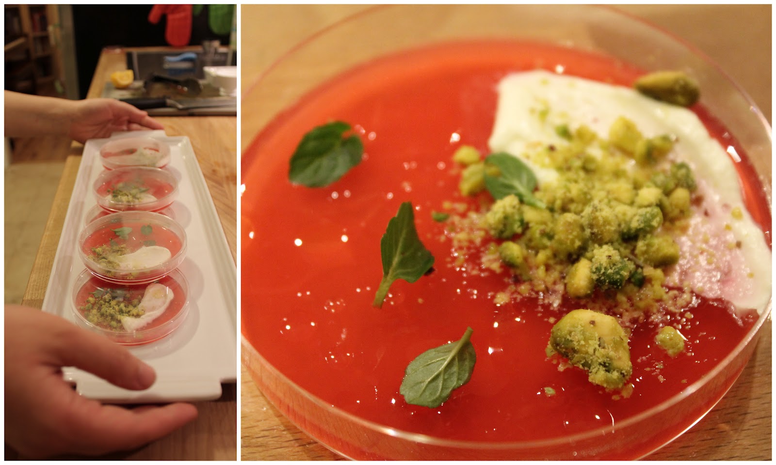 The first course: Petri Dish.  Blood orange gelée with a smear of local chevre, pulverized pistachios, droplets of meyer lemon juice and olive oil, micro peppermint leaves, and sea salt.