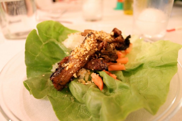 The third course: Pop Rocks.  Korean Pork Belly Ssäm with pickled radish, short grain rice, and a sprinkling salt made with unflavored pop rocks, Japanese 7 spice, and sea salt.
