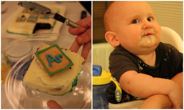 The sixth course: Periodic Table Cake.  Molly made the cake, I decorated it, and we all devoured it.  There’s just nothing like a moist chocolate cake with cream cheese icing.