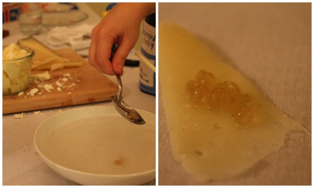 It worked! And it did so in spite of me completely abandoning the rigidly-precise spherification technique.  I just watered down some honey, spooned in some sodium alginate, and mixed it up with a fork. The spheres were perfect orbs of liquid honey, encased in an ultra-thin membrane. So hooray for taking a shortcut and having it work out ok! Sad note about the carbonated grapes, though- they had lost their carbonation :/ I just assumed they would stay effervescent, but they didn’t.  If you’re planning to try out this technique, it should probably be done right before you’re planning to eat them- the grapes look really cool in the foggy bowl of dry ice anyway.