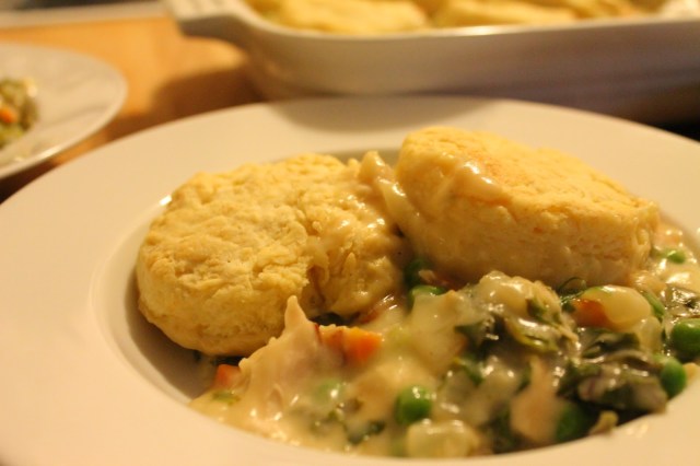 Anyway, despite the lack of blogging, I have been cooking as much or more than I ever did before. This means three homemade, largely unprocessed meals nearly every day, and I’m eager to share my favorites with you again. I’ve been trying a ton of new recipes, and I’ve been trying to cook healthier stuff too- much less white sugar and flour (don’t look at the top of this post). But for my triumphal return to blogging, I want to share with you one of my very favorite, pre-health-focused, dinners: chicken pot pie with biscuits.