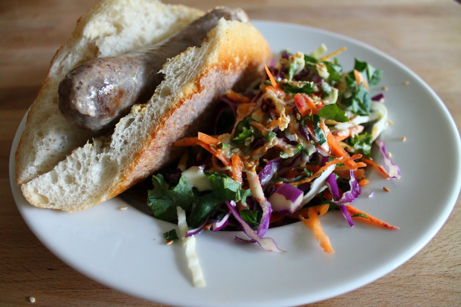 This beautiful slaw is a lovely way to eat your cabbage (and kale, and carrots, and another type of cabbage). The dressing is what really makes it great. It’s creamy and rich, but gets that way from tahini instead of dairy or mayo so it’s unabashedly healthy. It also keeps in the fridge (undressed) for days without showing any signs of fatigue. We ate it with roasted sausages (put them on a sheet pan in a 400 degree oven for 14 minutes and they’ll come out perfectly juicy) on baguettes with whole grain mustard.