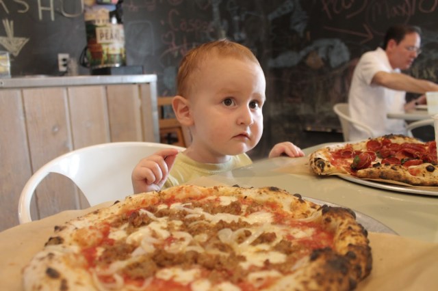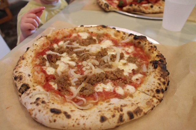 These fine fellows had a good time watching the pizzas fly in and out of the wood-burning oven (my two fellows on the left I mean. I don’t know the fellow on the right, but he probably enjoyed himself too). These pizzas crisp and blister in the fire in about a minute.