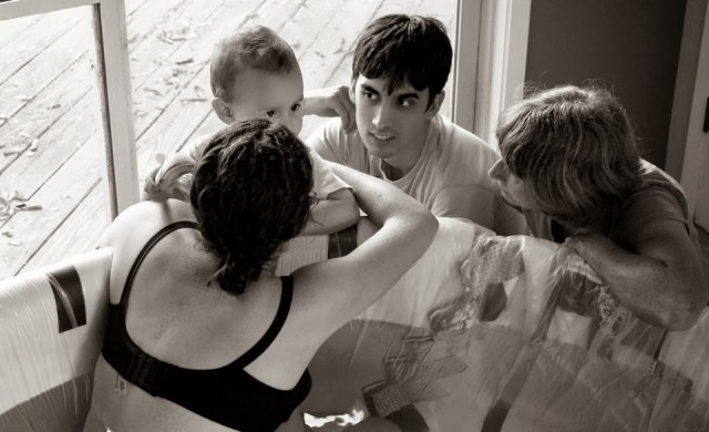 My contractions slowed way down when I was in the water.  It was a really lovely break- I even fell asleep for a bit- but I worried that I would never get anywhere if I stayed in the water. So I got out and did more side-to-side rocking a squat-like movements and things started feeling much more intense. Things are sort of hazy from this point on. I lay down in bed and started pushing, but I was still feeling pretty down, partly because my water hadn’t broken yet, so I figured I was still far from giving birth. I remembered reading about the power of self-talk in Ina May Gaskin’s Guide to Childbirth (my favorite pregnancy book by far) and so I said to myself, ‘on the next contraction, I’m going to push so hard that my water is going to break.’ If I was a more gracious person, I’d have said this out loud, because it worked (!) but I managed to splash Monika and Debra (my midwives) and Brandi (the student midwife) in the process.