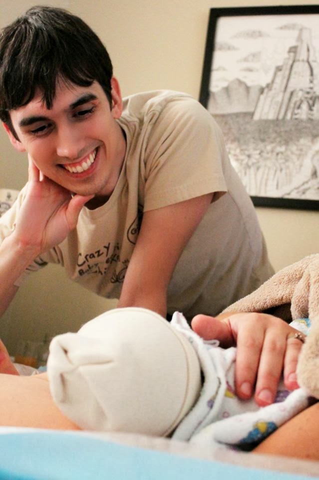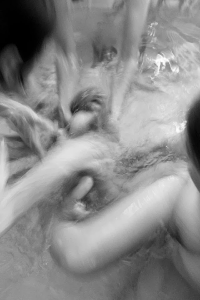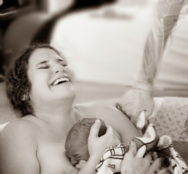 My contractions slowed way down when I was in the water.  It was a really lovely break- I even fell asleep for a bit- but I worried that I would never get anywhere if I stayed in the water. So I got out and did more side-to-side rocking a squat-like movements and things started feeling much more intense. Things are sort of hazy from this point on. I lay down in bed and started pushing, but I was still feeling pretty down, partly because my water hadn’t broken yet, so I figured I was still far from giving birth. I remembered reading about the power of self-talk in Ina May Gaskin’s Guide to Childbirth (my favorite pregnancy book by far) and so I said to myself, ‘on the next contraction, I’m going to push so hard that my water is going to break.’ If I was a more gracious person, I’d have said this out loud, because it worked (!) but I managed to splash Monika and Debra (my midwives) and Brandi (the student midwife) in the process.