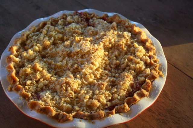 A strawberry rhubarb pie with coconut and oat crisp topping. Delicious! My May pie of the month is a gluten and dairy free version with a lattice top- I’ll post it soon.