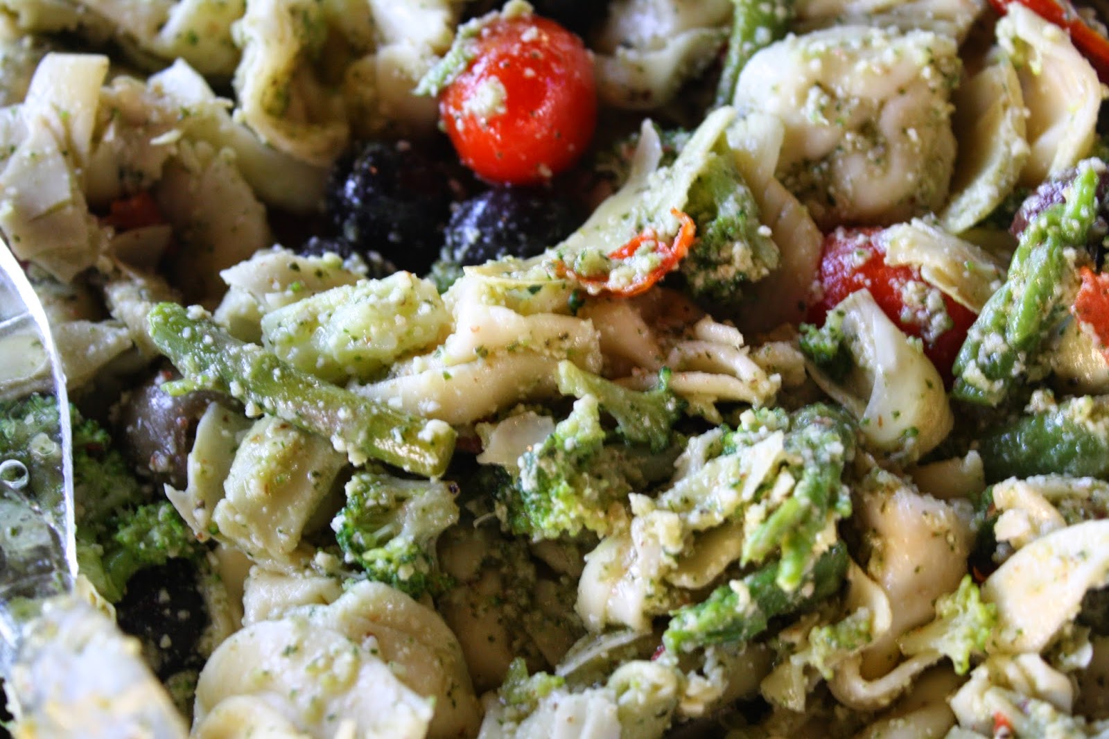My sister makes a phenomenal pasta salad. She’s got a couple tricks- she uses tortellini instead of regular pasta (amazing) and makes a pesto heavy on the walnuts and parmesan. The whole thing is rich and creamy and delightful, and is enlivened by bursts of lemon-y asparagus, briny olives, and sweet roasted tomatoes.