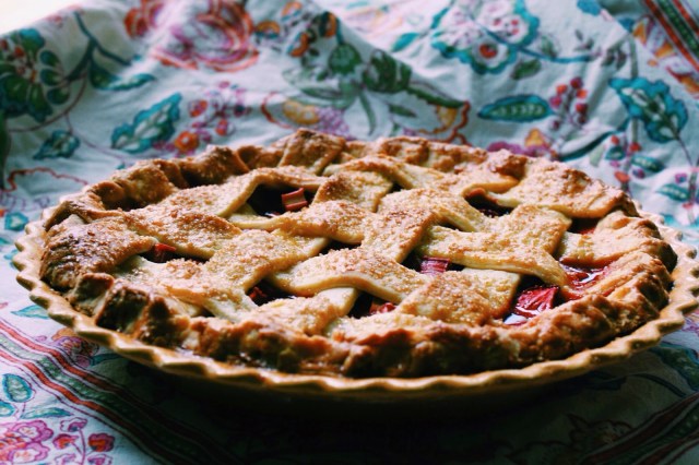 When you’re ready to roll out the crust, on a well-floured work surface, gently roll out the pie crust into about an 11-inch circle. Press together any spots that might tear. Carefully lift down and place into the 9-inch pie plate. Use a pairing knife to trim the edges of pie dough, leaving about 1/2 inch extra dough overhang. Fill pie plate with strawberry rhubarb filling. Brush edges of the pie dough with a bit of water. Repeat the dough rolling process and slice the rolled dough into one inch strips. Carefully place every other strip in parallel lines across the pie, leaving one inch spaces in between. Fold back alternating strips and place the remaining strips perpendicularly across the others, one at a time, folding the strips down between strips. If that made no sense at all, check out