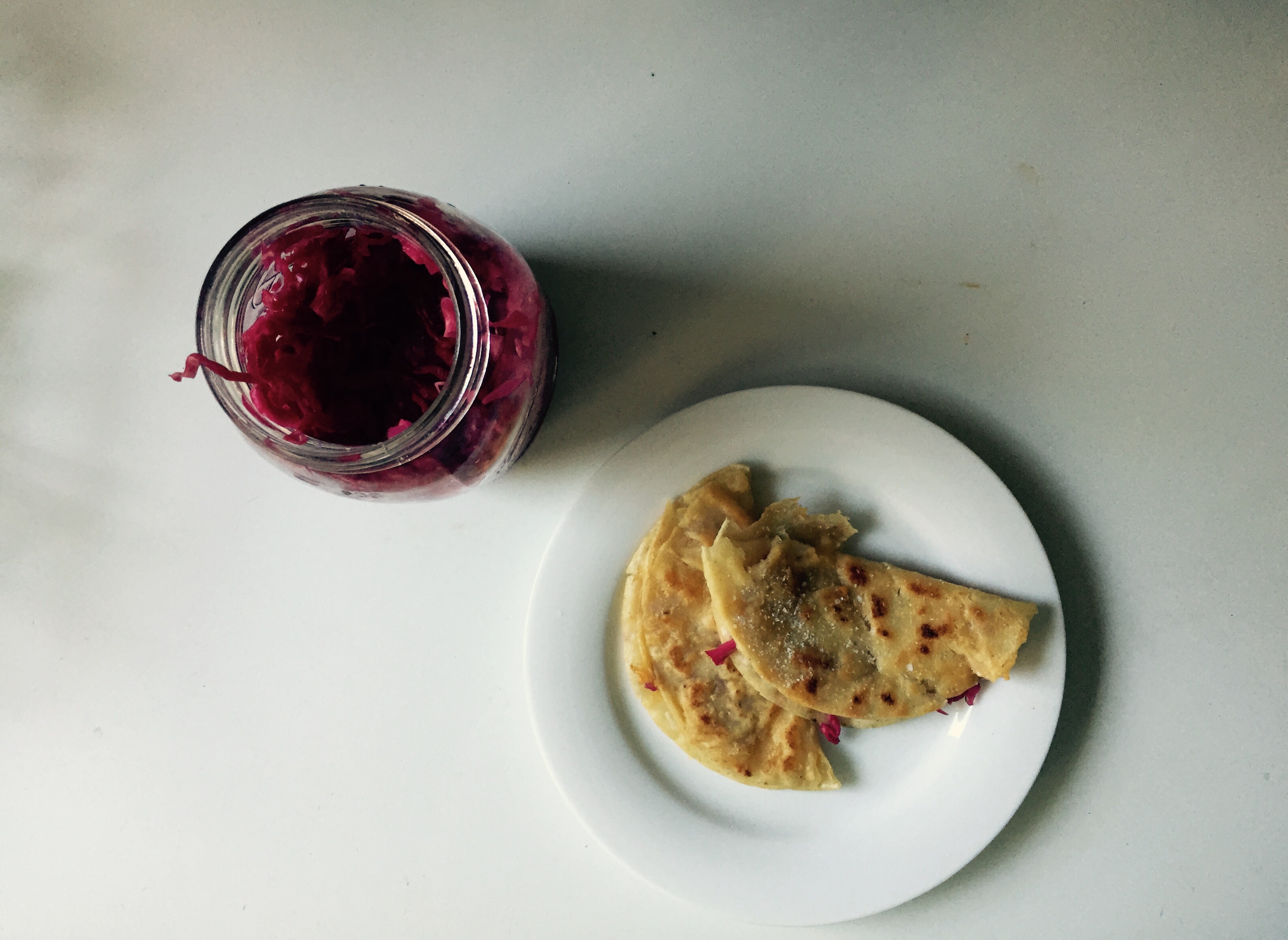 Quesadillas with Sauerkraut. This has been my daily breakfast for the last month or so. I melt a tablespoon of butter in a skillet and crisp up two corn tortillas, each filled with grated cheddar cheese. When they’re crispy I sprinkle them with kosher salt and pry them open with a butter knife and add a forkful of sauerkraut. The kraut is sour and crispy and salty and slightly effervescent (not to mention loaded with fantastic probiotics) and is a perfect match for melted cheese. Heat kills the good bacteria in the kraut, so I always add it at the end of cooking, not the beginning. Also, don’t be scared of sauerkraut. It’s simply cabbage tossed with salt, left to sit in a container for a few weeks. It’s dead simple, delicious, great for you, and keeps in the fridge for a year after you’re done!