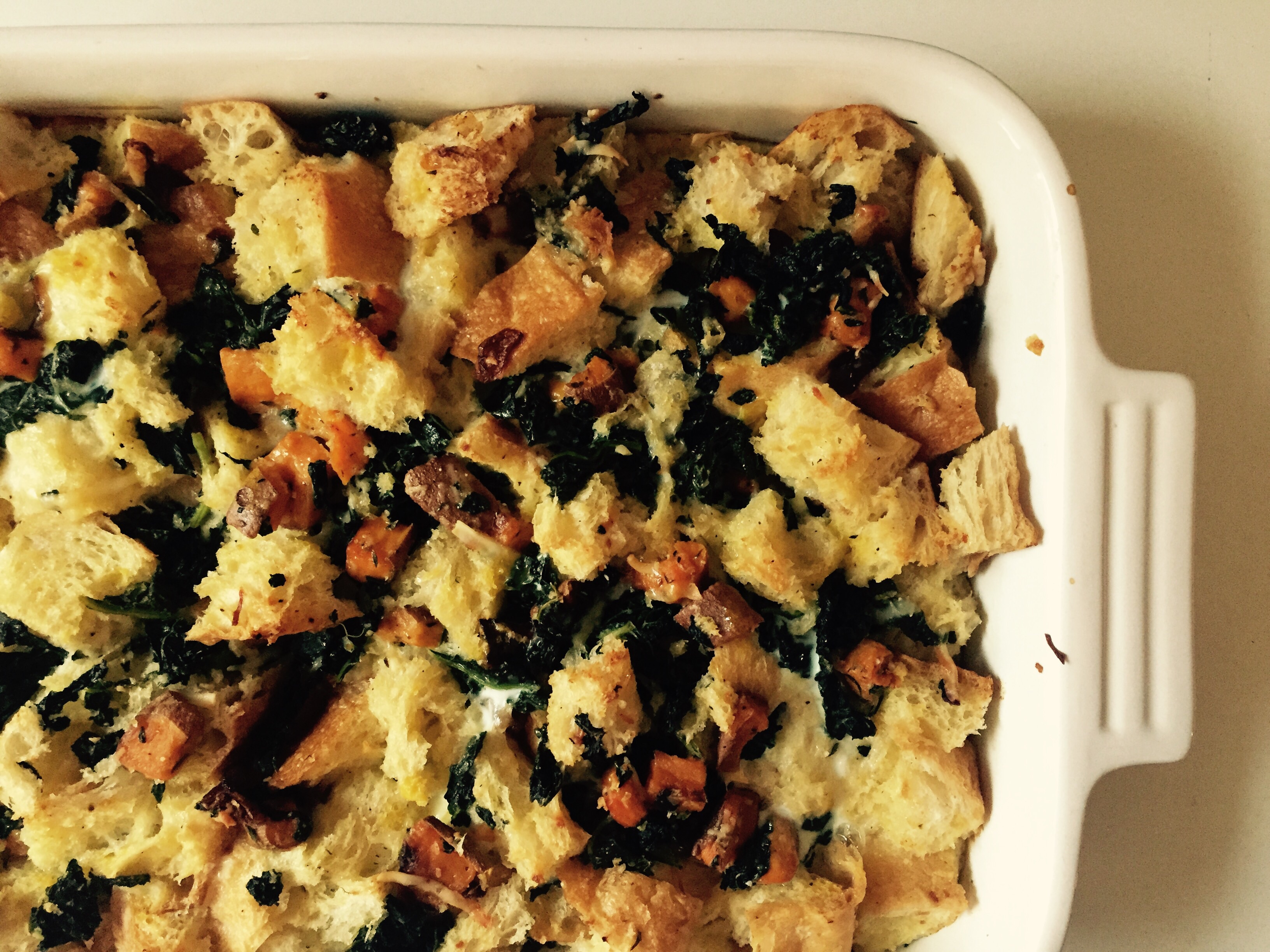 Savory Bread Pudding with Kale and Sweet Potatoes. The original recipe called for mushrooms in place of the sweet potatoes, and I substituted them because I had cubed roasted sweet potatoes left over, but it wasn’t a great swap. They were just too sweet in this savory application. Also, be sure you use a stale or hearty whole grain loaf, otherwise the bread at the bottom is a bit too soggy. I liked this recipe a lot better sliced and reheated in a skillet with melted butter the next day- it was more like a savory french toast, with crispy buttery edges.