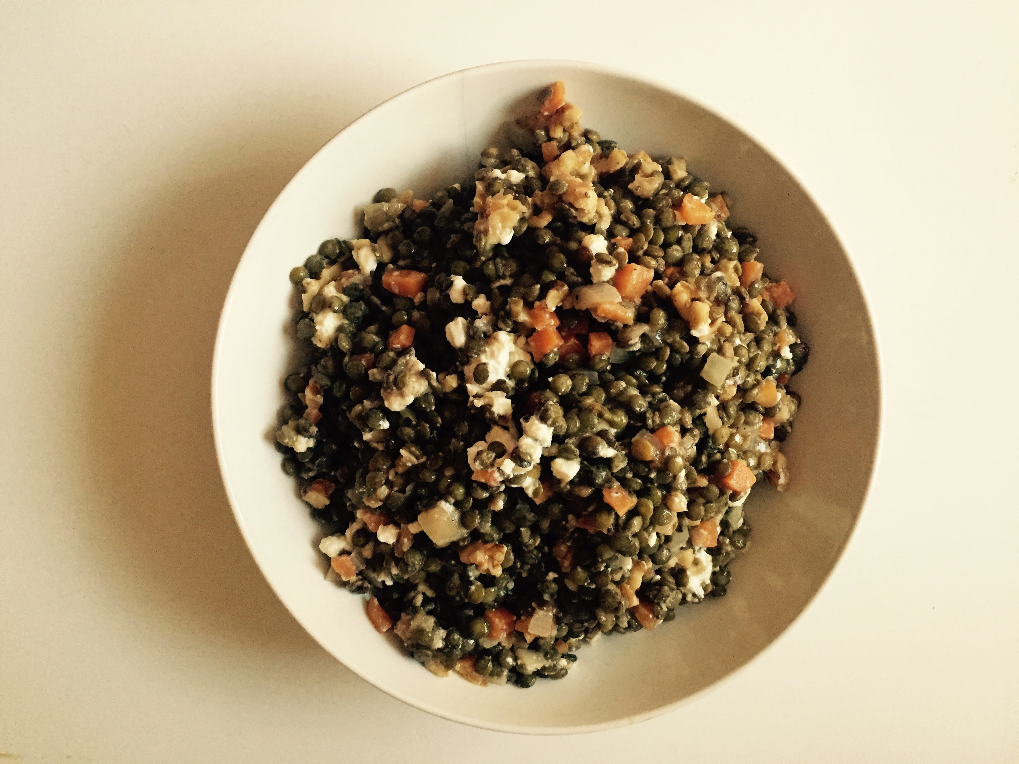 French Lentil Salad with Goat Cheese and Walnuts. I served this with the kale bread pudding and both Andy and I were surprised to find we liked it better than the main course. I didn’t have parsley, so omitted it, but this was great right after I made it and leftovers held up beautifully in the fridge too.