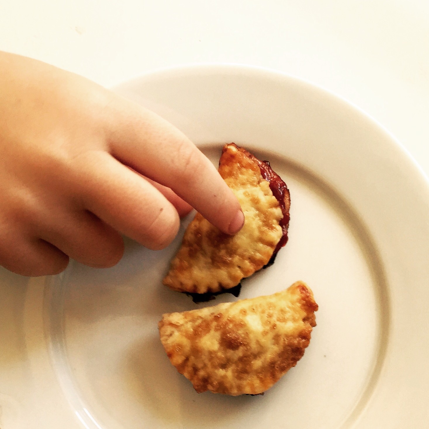 We had a few scraps of dough leftover from the root pies and so we rolled them out, cut circles with a cookie cutter, spooned in a teaspoon of strawberry jam and crimped the edges with a fork. I brushed the tops with egg wash and sprinkled them with sugar and baked them at 400 degrees for about 10-12 minutes, until they were crispy and the jam was oozy. Henry went wild for them.