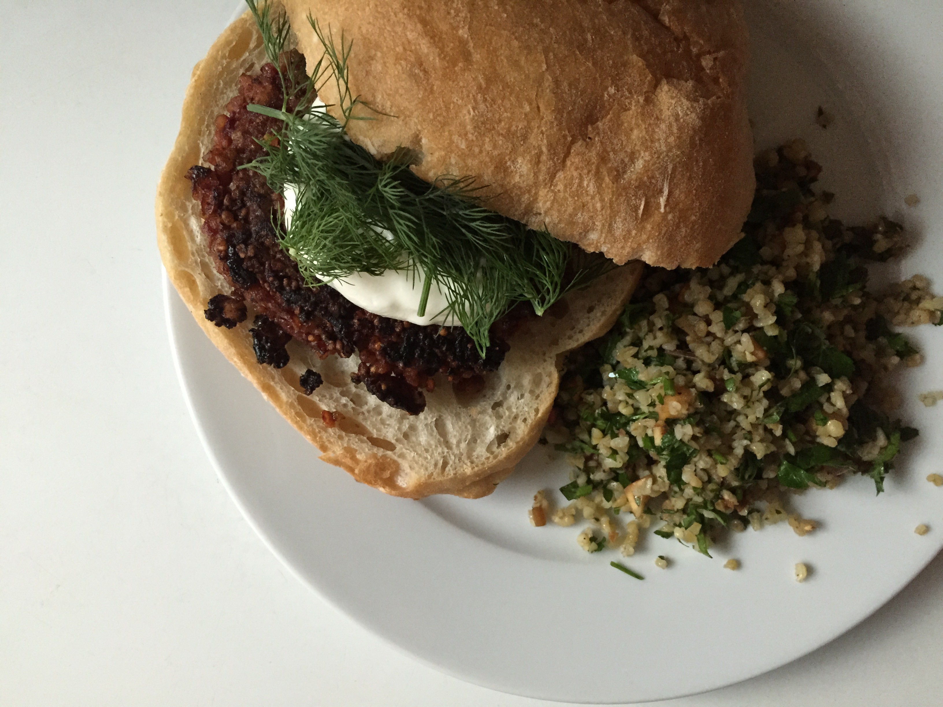 Sweet and Smoky Beet Burgers. Charoset Tabbouleh. I love these beet burgers. They’re topped with thick yogurt and a mound of dill, and a tomato/cucumber salad too if you’ve got the time. They’re a bit of a production though- they call for cooked lentils and also cooked rice as ingredients, which adds to the prep time. Because I had neither of these things I cooked bulger wheat to replace the rice and used half a jar of black beans I had in the fridge instead of the lentils- the burgers were still great. I used the rest of the bulger to make a tabbouleh-esque thing with the leftover Passover parsley and mint from the garden. Instead of the tomatoes and pomegranates called for in the recipe, I mixed in some charoset leftover from Passover, which is a combination of dates, apples, nuts, pomegranate mollasses, and honey. It was so so good in tabbouleh.