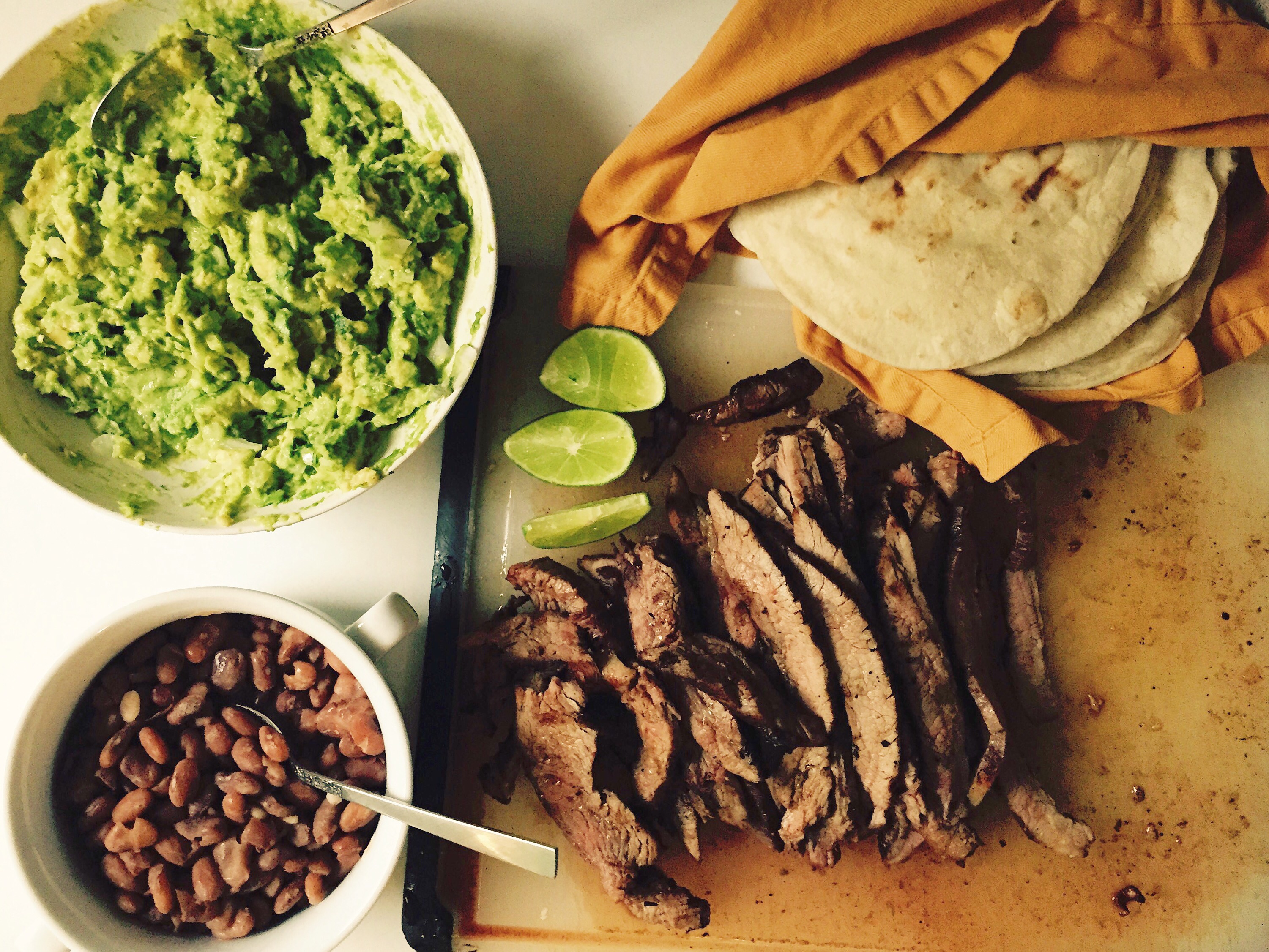 Beef Fajitas, Beans, Guacamole. It’s been raining here all week, and maybe all month? But the clouds parted long enough for me to grill up some skirt steak for dear ole Andy. I love the super simple marinade from the linked recipe (that torta is good too!). Beans and guacamole, I’m sure you’ll recognize, dear reader, are my favorite accompaniments to anything vaguely Mexican.