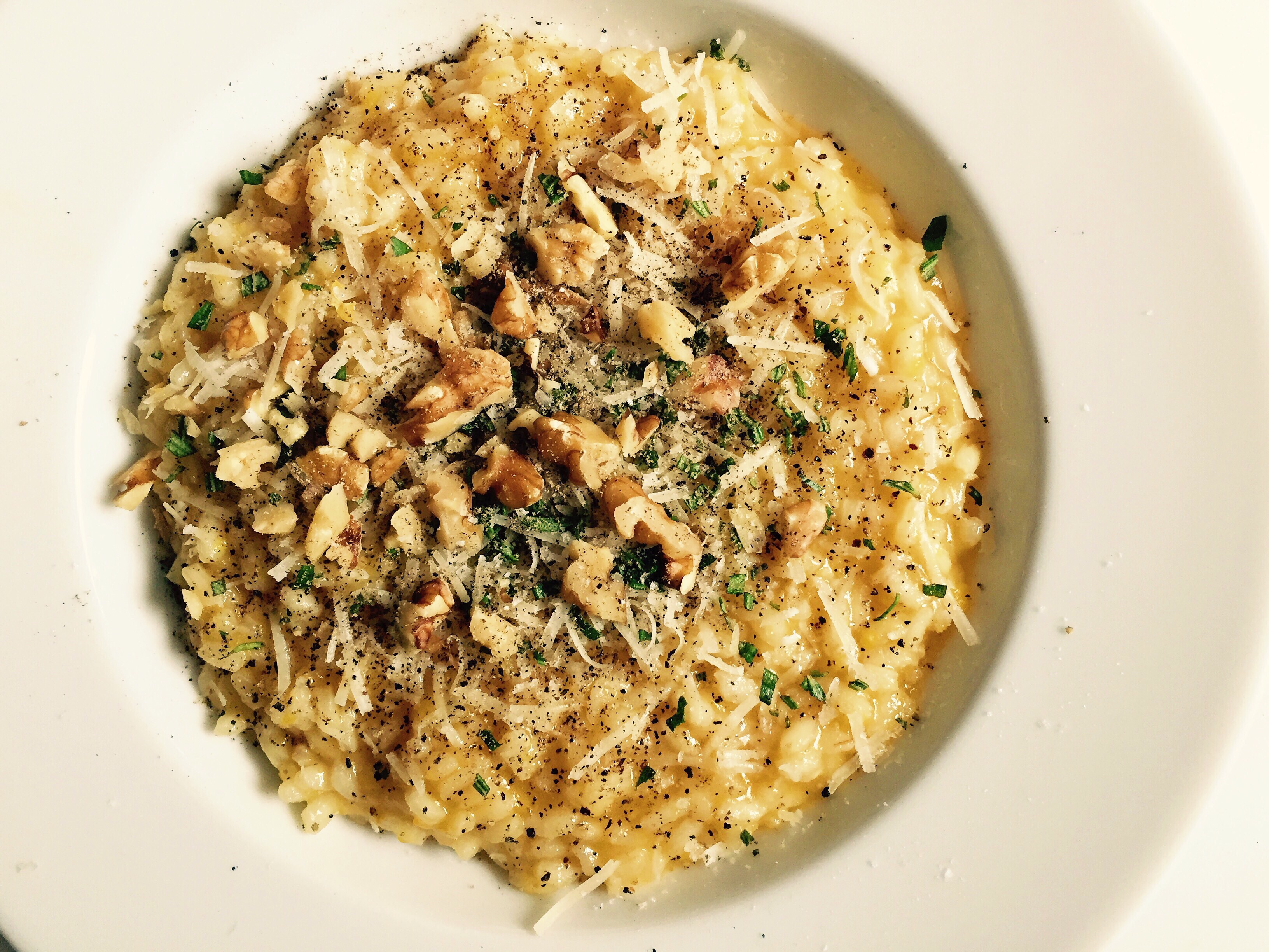 Butternut Squash Risotto with Rosemary, Lemon, and Walnuts. Henry’s, and possibly George’s, favorite dinner. People say they’re scared of risotto, because of all the stirring, I think. But it really doesn’t bother me much. George was super clingy while I was making this so I had to pull a stool up next to the stove and nurse him while I stirred. I didn’t mind because I like sitting so very much. Anyway, risotto. Saute the allium of your choice (I usually use onion instead of leeks because it’s what I’ve got), add the rice, skip the wine if you don’t have it (I never have it), and ladle in a half cup of hot chicken stock at a time, stir and add more as the rice absorbs it, repeat for 25 minutes or so, until the rice is just cooked. The butternut is grated and added at the same time as the rice, and it magically melts into the risotto and makes it creamier and gives it a subtle sweetness that works great with the parmesan and other garnishes. Henry ate three bowlfuls, and George finished his serving, making it pretty much the only meal that he’ll eat from start to finish.