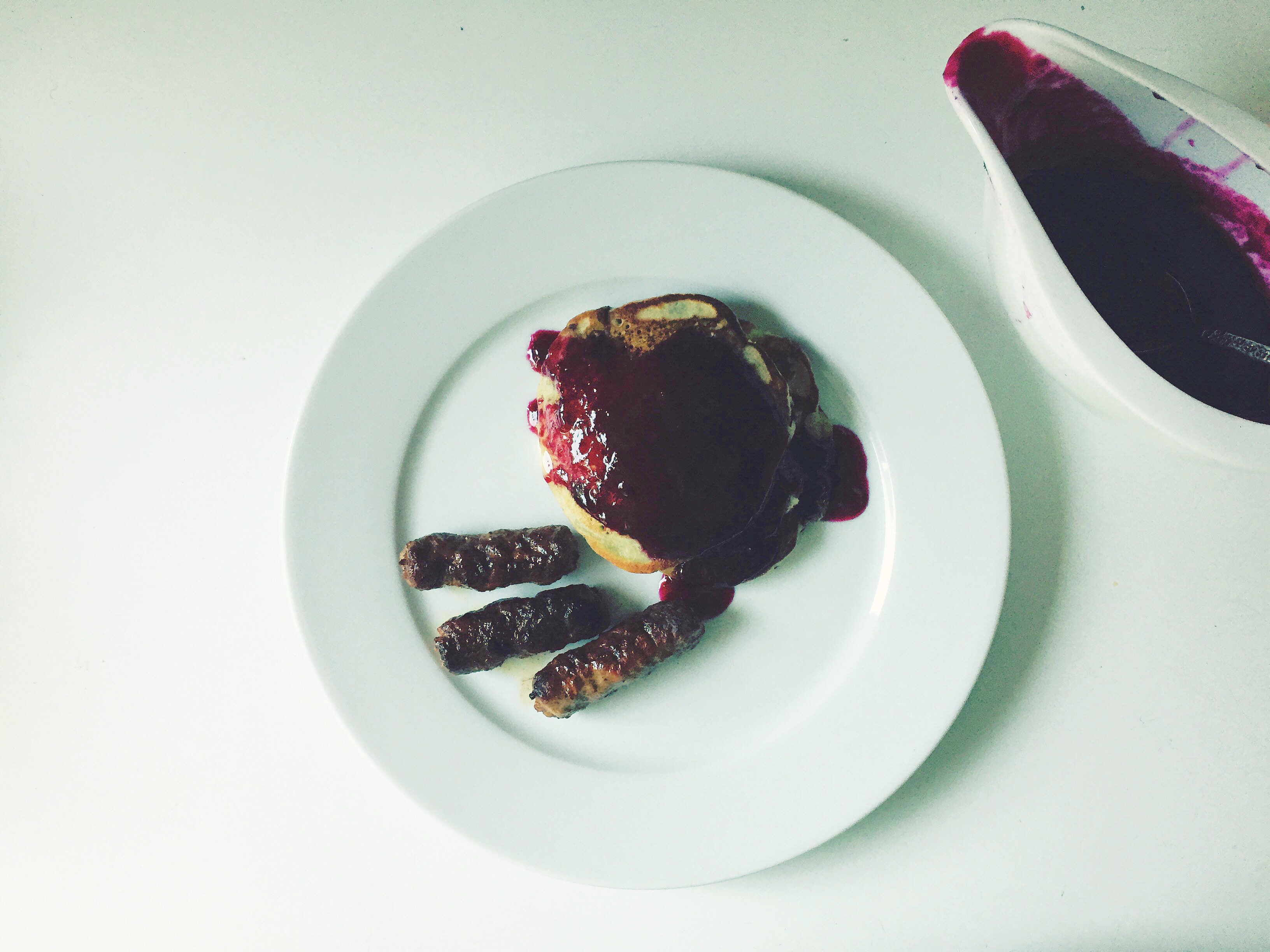 Blueberry Pancakes with Blueberry Lemon Sauce, Sausages. It was late Friday afternoon and Henry and I were talking about dinner. I told him we were going to have roasted spring onions with sage pesto and a big kale salad. His response: let’s have pancakes and sausages. Well ok! We didn’t have any syrup, so Henry and I made a blueberry syrupy thing for them instead. He said it tasted like gummies (highest possible compliment) and we ate every last drop. Henry loves sausages so much that he said he wants his sixth birthday to be a sausage party, where you just eat sausages all day. His fifth birthday party is to be a bowling one, if you’re keeping track.