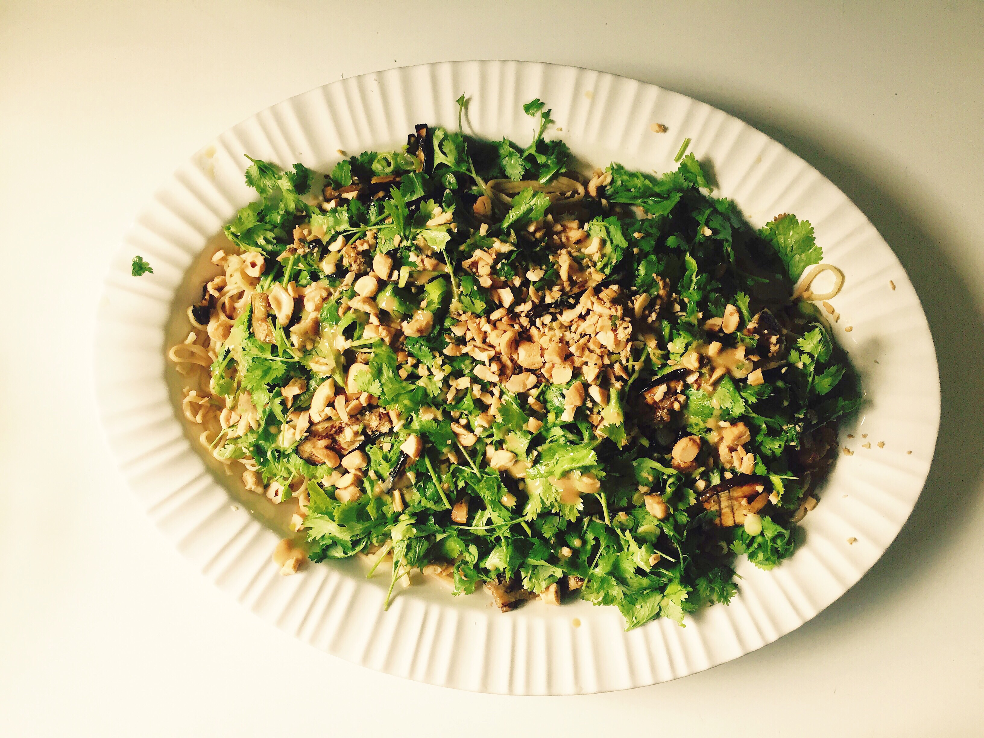 Thai Salad with Grilled Eggplant and Sesame Noodles. The linked recipe uses skirt steak, but I subbed eggplants for the meat. I brushed sliced eggplant with the marinade just before tossing them on the grill (brushed instead of tossed in the marinade to ensure that all the pieces got coated, otherwise the first few might’ve soaked up all the liquid). I grilled them until they were nice and brown and then chopped them up a bit more. I liked it! The eggplant is nice and meaty, and the warm/grilled bits were great with the mountain of cilantro and sesame noodles.