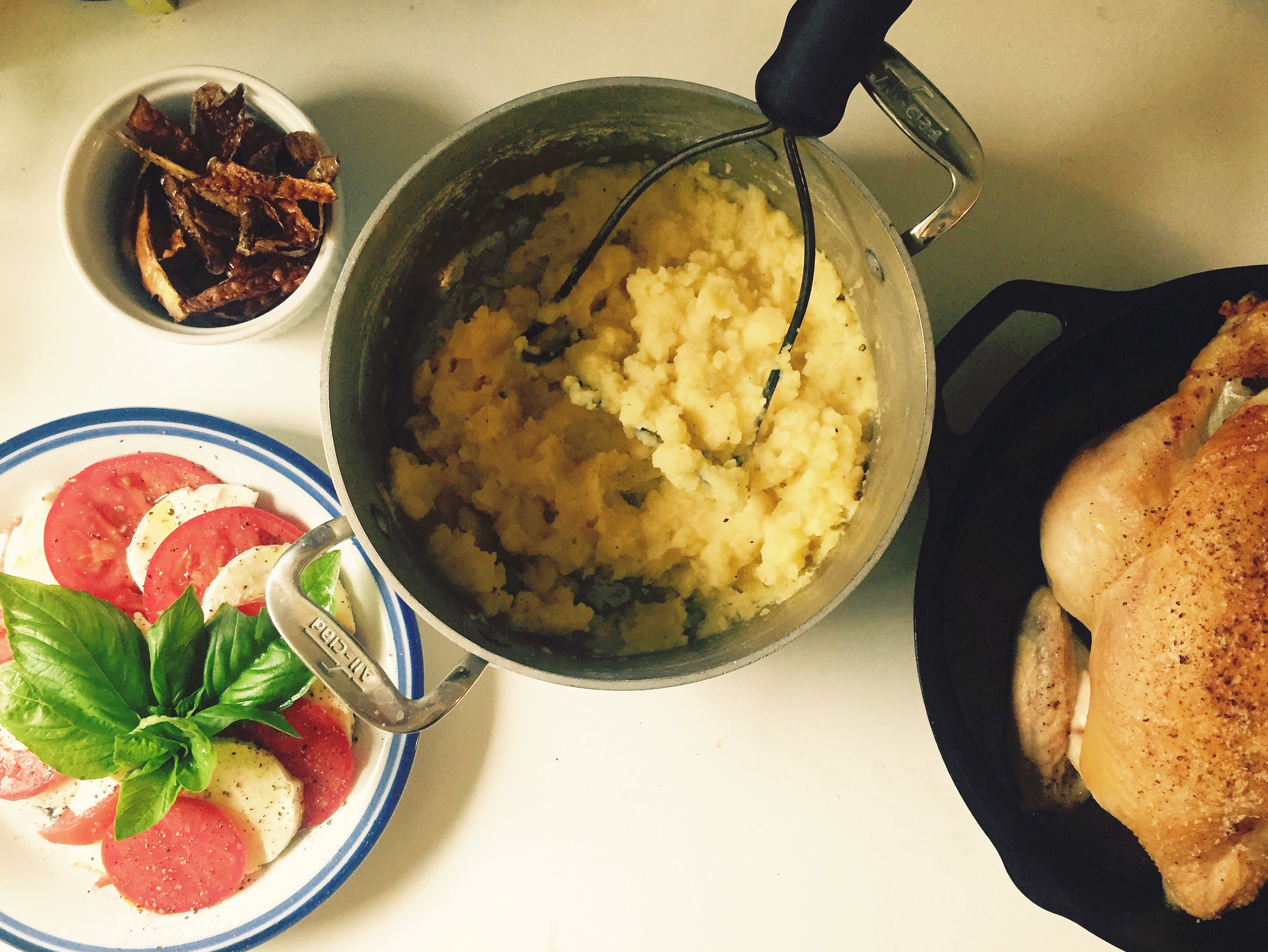 Roast Chicken, Mashed Potatoes, Caprese Salad, Crispy Potato Skins. I thought eating all these things together was weird. Caprese salad doesn’t go with mashed potatoes. I don’t know why I do these things. I saved the peels from the potatoes and tossed them with oil and salt and pepper and roasted them with the chicken for a crispy little snack that would have been delicious had I not burned them 😐 I also under cooked the mashed potatoes and they were lumpy and I didn’t add enough butter and this dinner just blew, honestly. So, yeah. Food bloggin’, y’all!