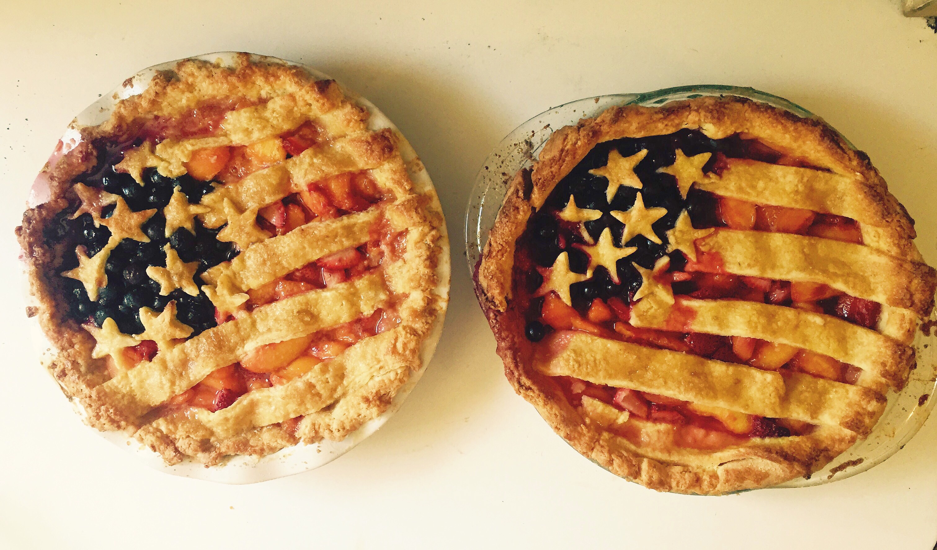 Peach, Strawberry, and Blueberry Pies. For the fourth of July, we spent nearly 4 hours in a swimming pool and then ate bacon cheddar burgers on glazed donut “buns” like the American heros we are. It was spectacular. These pies were a hit- they were basically this pie, with substitutions for the fruit.