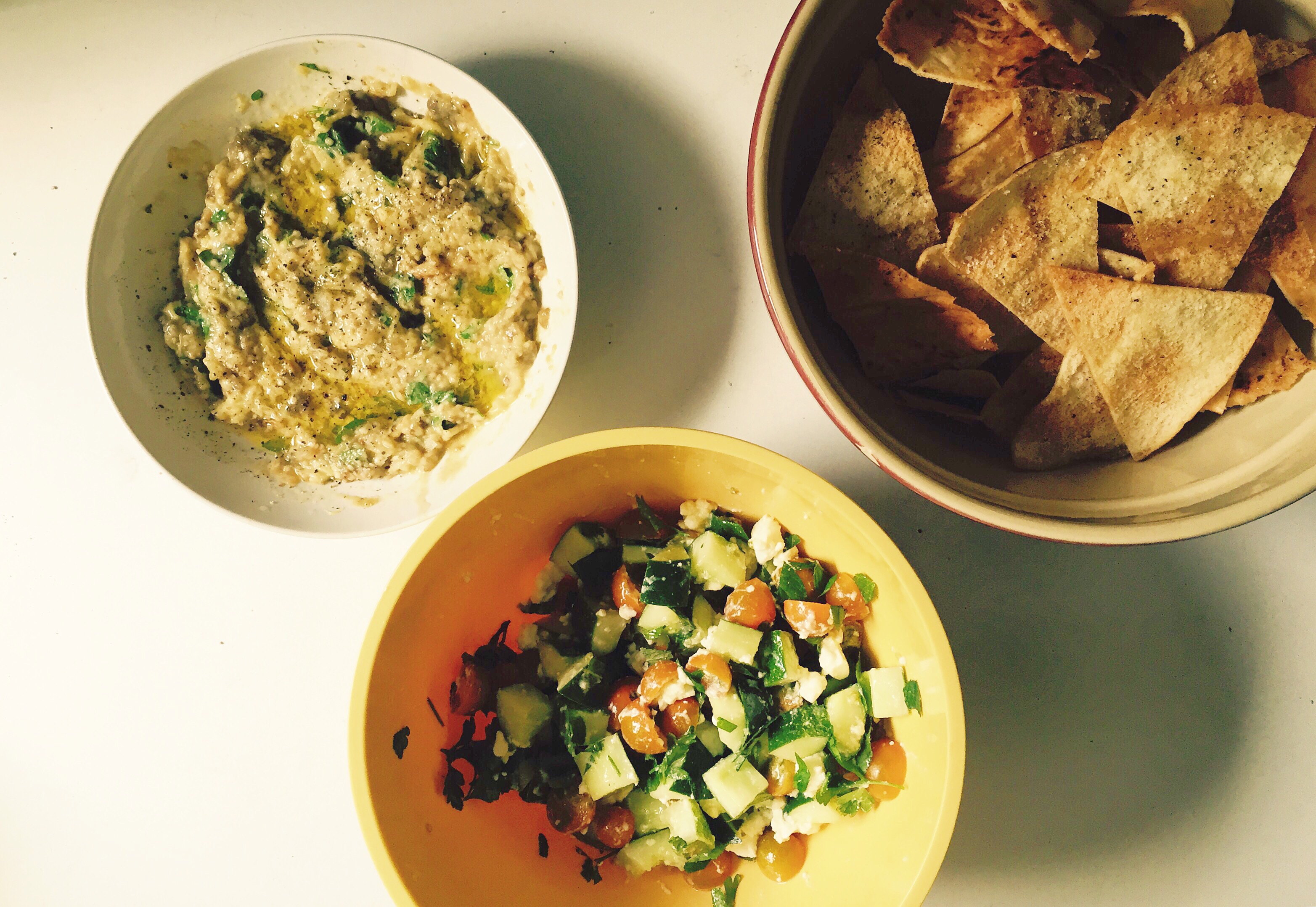 Baba Ganoush, Tomato, Cucumber, and Feta Salad, Pita Chips. I cut Phoenicia pita bread into wedges, peel the two layers apart, and toss them with olive oil, salt and pepper, and crisp them on a cookie sheet in a 375 degree oven for about 8 minutes. We dipped the chips into baba ganoush, a weirdo mushy eggplant dip that I like very much. Apparently there’s some debate about whether or not to include tahini, but it’s an obvious yes to me. I like it to taste like a sort of eggplant hummus, with tahini, lemon, and olive oil. The salad is just the diced veg with parsley and mint, lemon juice, olive oil, crumbled feta and salt and pepper. I don’t have anything interesting to say about it, but it is tangentially related to the terrifying mutant cucumber we grew in the garden (instagram pic of monster cucumber). Overlooked for weeks, when we finally uncovered the beast Henry ran screaming from it. We weren’t brave enough to cut into it- I threw it in the compost. Do people eat these things?