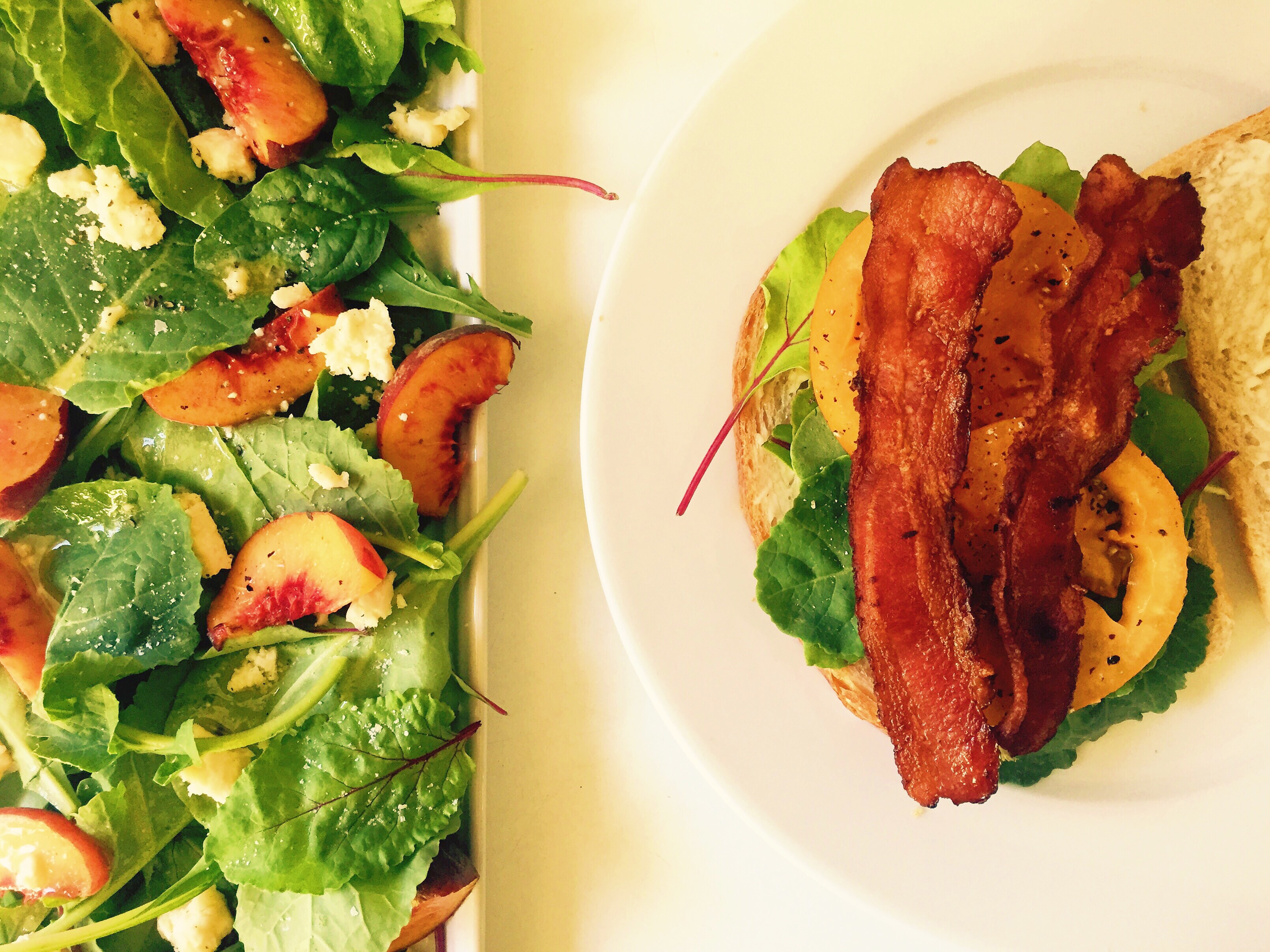 BLT, Peach Salad. Check it out, y’all. Salad! Plus a BLT is basically a salad on a sandwich (plus bacon). So that’s like two salads in one meal and we’re set for the week. Do click on the link for the peach salad (if you don’t already follow Dash and Bella) to see a gorgeous post about eight salads you’ll want to eat right now. With two kids who will occasionally eat what you put in front of them but will always eat it if what you put in front of them is bacon, we may have reached the tipping point where one package is not enough to meet our needs. This two-slices of bacon BLT is borderline un-American.