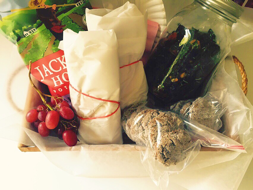 Lunch for Friends on Moving Day Basket. When you drive into someone’s new garage door, which is attached to their brand new house, you should apologize by making them pan bagnat sandwiches and cookies and kale salad. It worked for me!