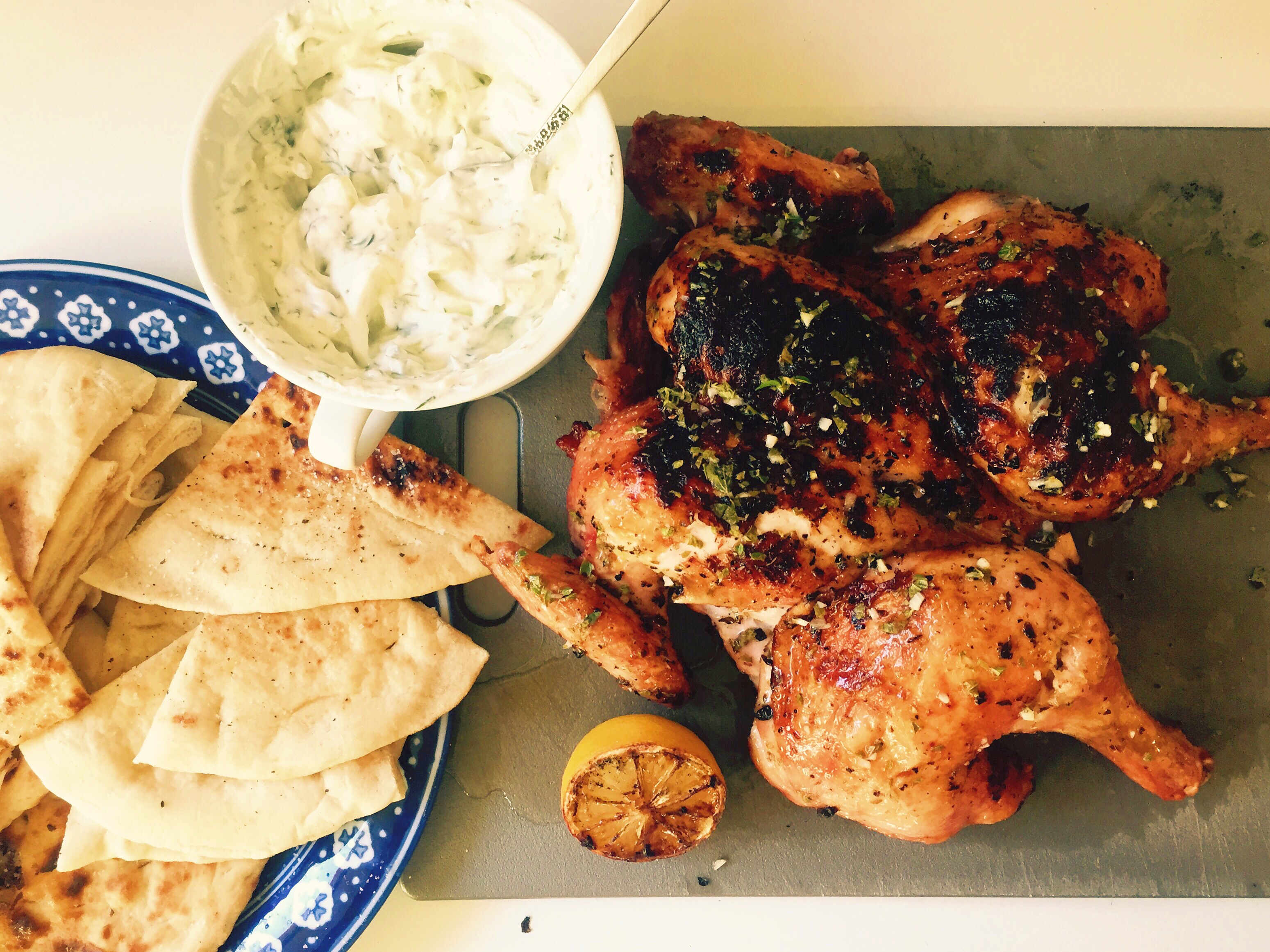 Greek-Style Grilled Chicken with Lemon and Oregano, Naan, Cucumber/Yogurt Thing. Oh, I liked this chicken! I cooked it a lot longer than the recipe called for and I thought it was perfect. I’ve got one of those big barrel-type charcoal grills and I think it doesn’t get as hot as the regular kettle kind (at least with the same amount of charcoal) so chicken cooked indirectly seems to always take longer than the recipes say. That was boring and you don’t care. But make it and cook it longer than it says to if you feel like it, that’s all I’m saying.