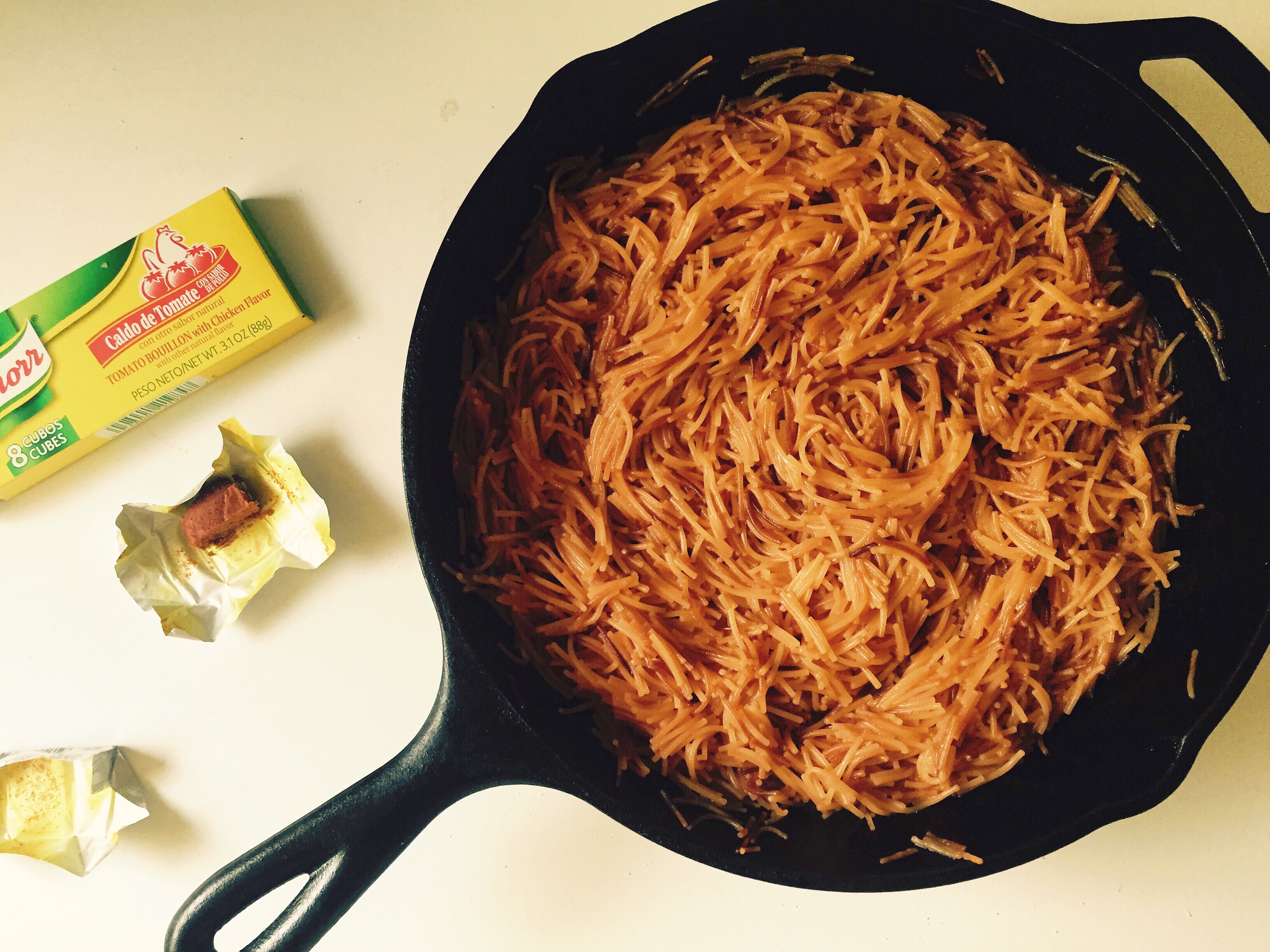 Sopita. Another dish stolen from my friend Amanda! And her granny. If you’re in a Mexican grocery store, buy a box of that chicken tomato bullion (just do it) and a little bag of vermicelli. Saute the noodles in a little oil until they’re golden brown, then add water and 1 1/2 cubes of the bullion, stirring to dissolve it in the water. Stir and taste the noodles, adding more water if you want it soupier, or if it has all been absorbed before the noodles are done cooking. This rocks, and costs just about $1.