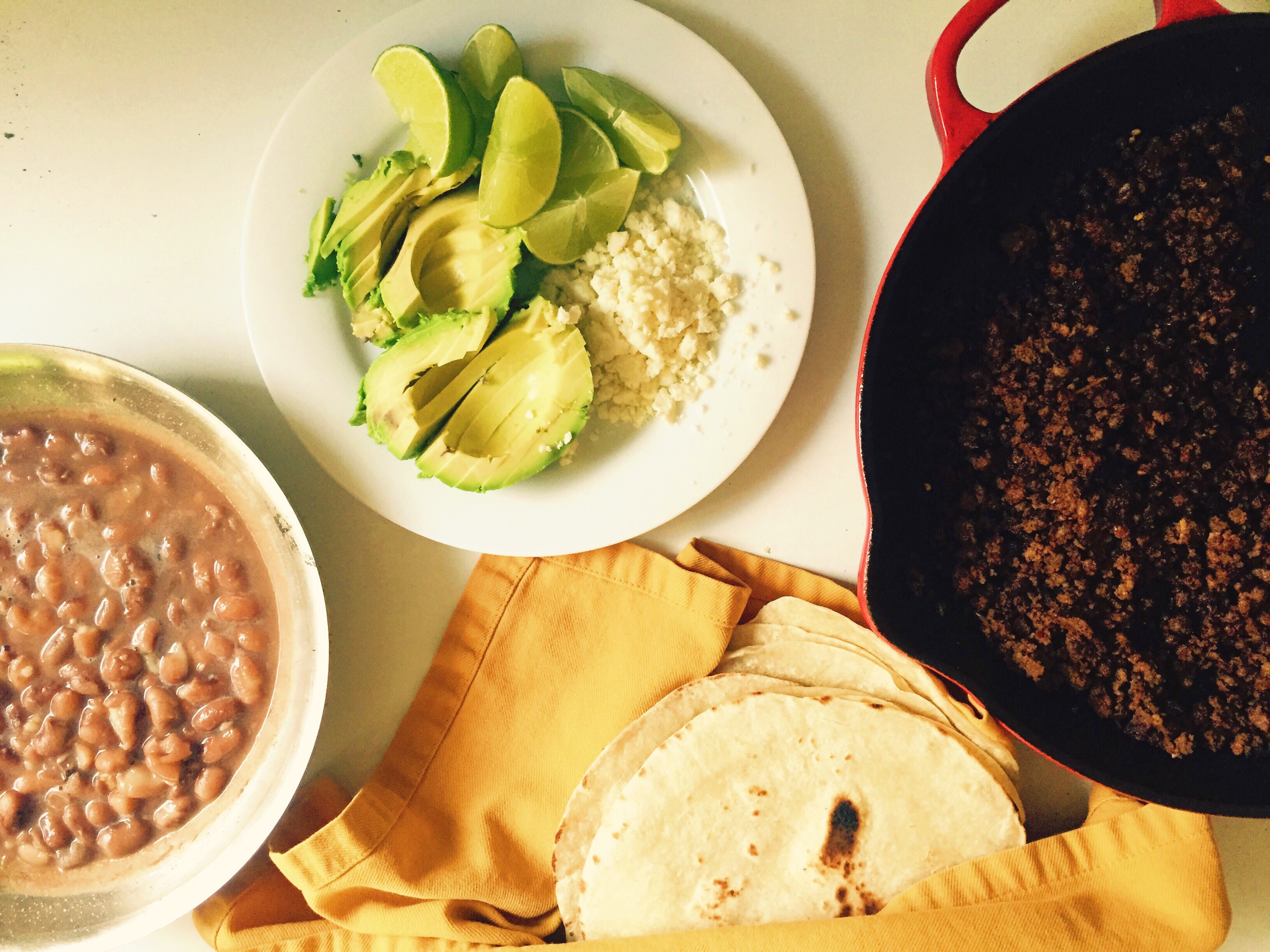 Chorizo Tacos, Beans. Richardson Farms (they sell at the Sunset Valley and Barton Creek Saturday farmers’ markets) makes a fresh Mexican-style chorizo that I just love, and that has basically no heat to it, so my kids like it too. For an easy dinner I just crisp it up in a pan and serve it with beans and cotija, avocado, and lime.