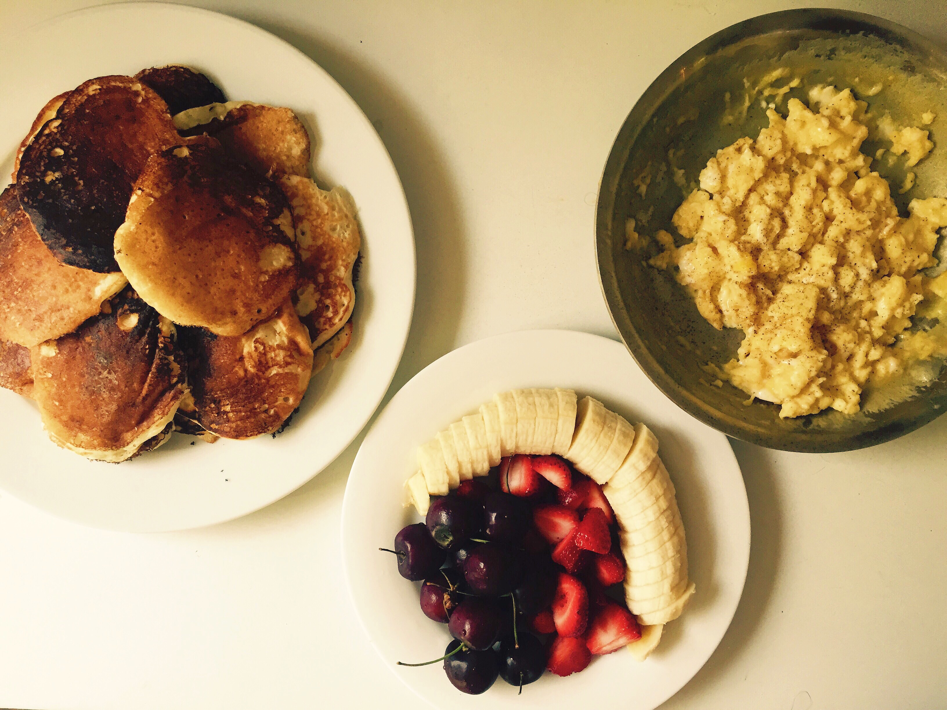 Pancakes, Scrambled Eggs, Fruit. When we got back from San Antonio I had no willpower and no meat or vegetables in the house. I had eggs and fruit and baking stuff though, so we had pancakes. Which I burned, because that’s just how I make them, I guess.