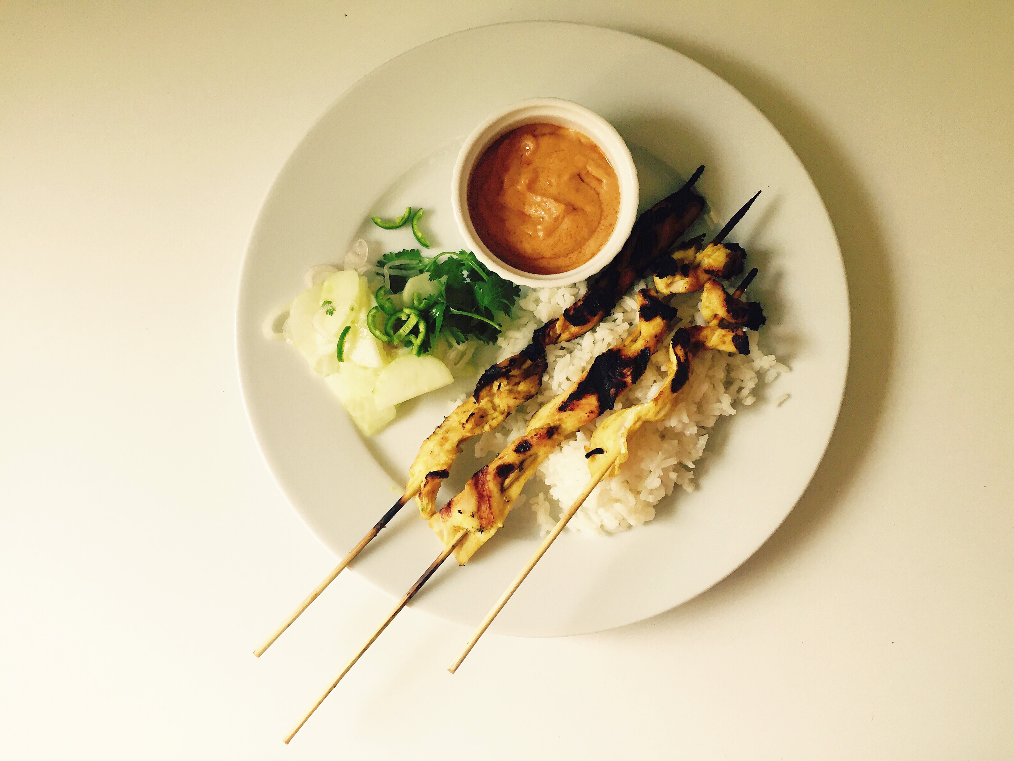 Chicken Satay with Peanut Sauce, Cucumber Relish, Rice. I can assure you I ate four times that amount of chicken skewers. I only put those three in the picture because I didn’t oil the grill well enough and all the chicken stuck to it and tore off the skewers when I tried to flip them and I had to pry the charred pieces off the grill. But they still tasted awesome. That peanut sauce, y’all. I tasted it and then brought spoons around to Henry and George and Andy and I went back for more. I could drink the stuff like a milkshake, it was so creamy from coconut milk and ribboned with thai curry paste. Composing bites of chicken with that sauce and fresh and crisp cucumber relish was such a pleasure.