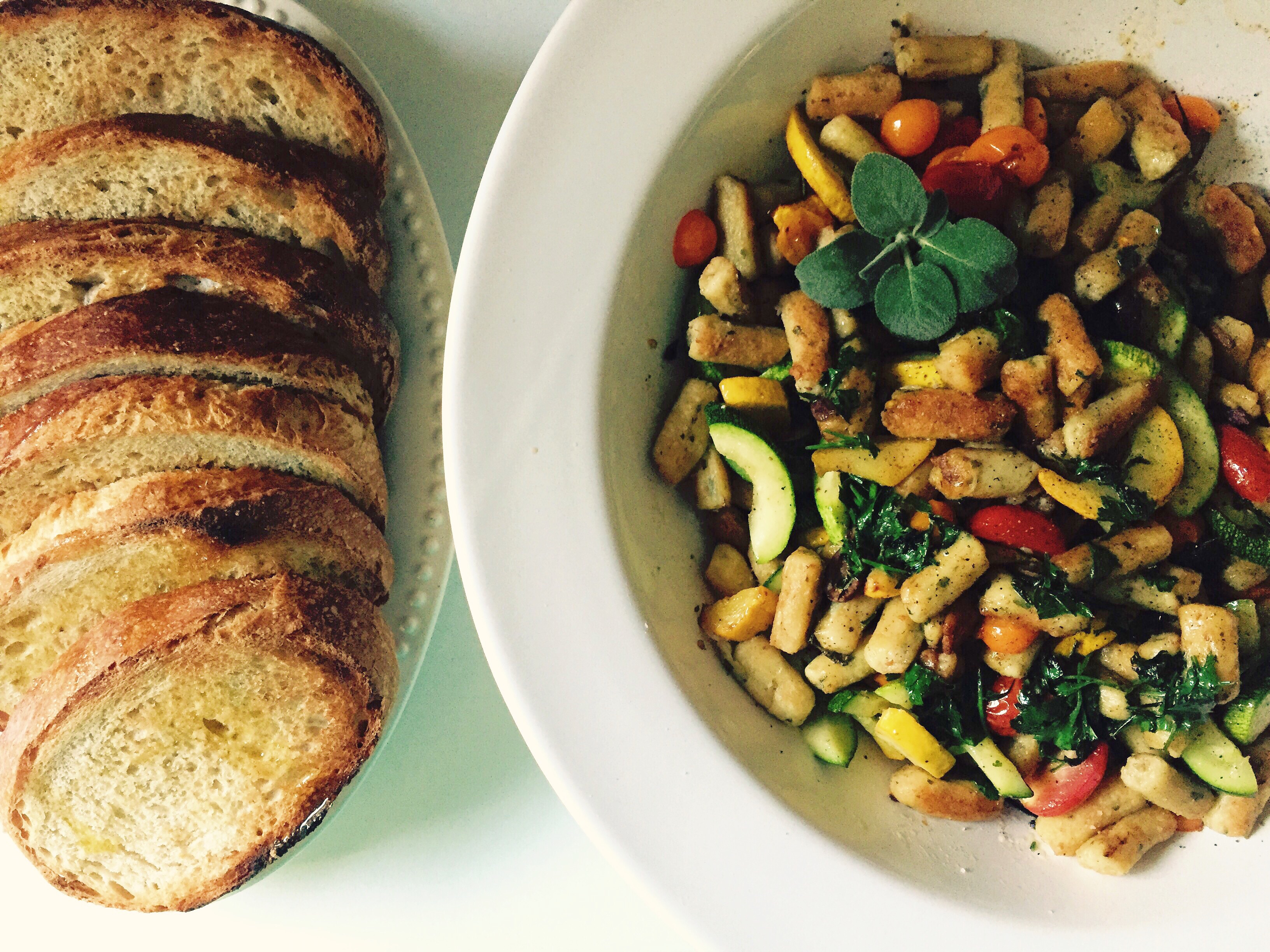 Gnocchi a la Parisienne with Summer Vegetables, Bruschetta. I got to spend my birthday doing exactly what I wanted- cooking an elaborate and time-consuming meal for myself (and my family! I shared, you guys). And my sister helped me, which was really fun because babies (really nice ones!) have made it hard for us to do that recently, and she’s my favorite person to cook with. I thought and thought about what I wanted to make, and settled on this gnocchi because I love it dearly, and it takes forever, which would usually make me feel guilty, but not on my birthday. It’s the same dough you’d use to make eclairs and profiteroles, except you mix in comte and dijon mustard and lots of lovely herbs. Then you pipe the gnocchi into simmering water, and then you crisp them up in brown butter and toss them with gently warmed squash and tomatoes and nicoise olives, and then you pour more brown butter on top. It’s spectacular, every bite. We ate every last bit and then mopped up the pan sauce with our grilled bread.