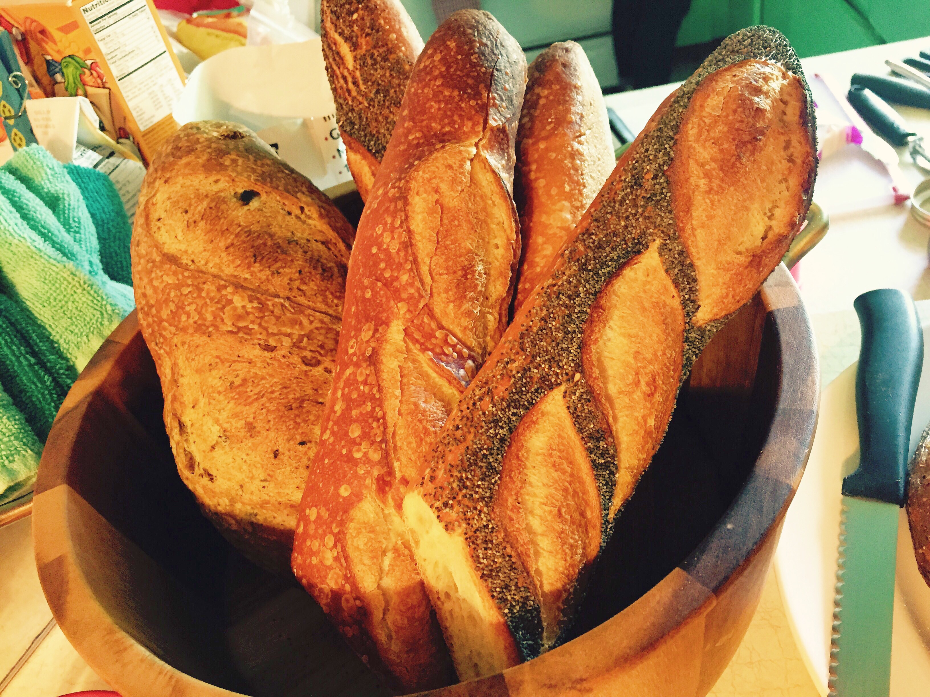 She went to the Barton Creek farmers’ market to buy my very favorite breads! An olive batard and regular and poppy seed baguettes from Baguette et Chocolat. With a crock of butter, I spent a lot of time next to this bowl of bread.