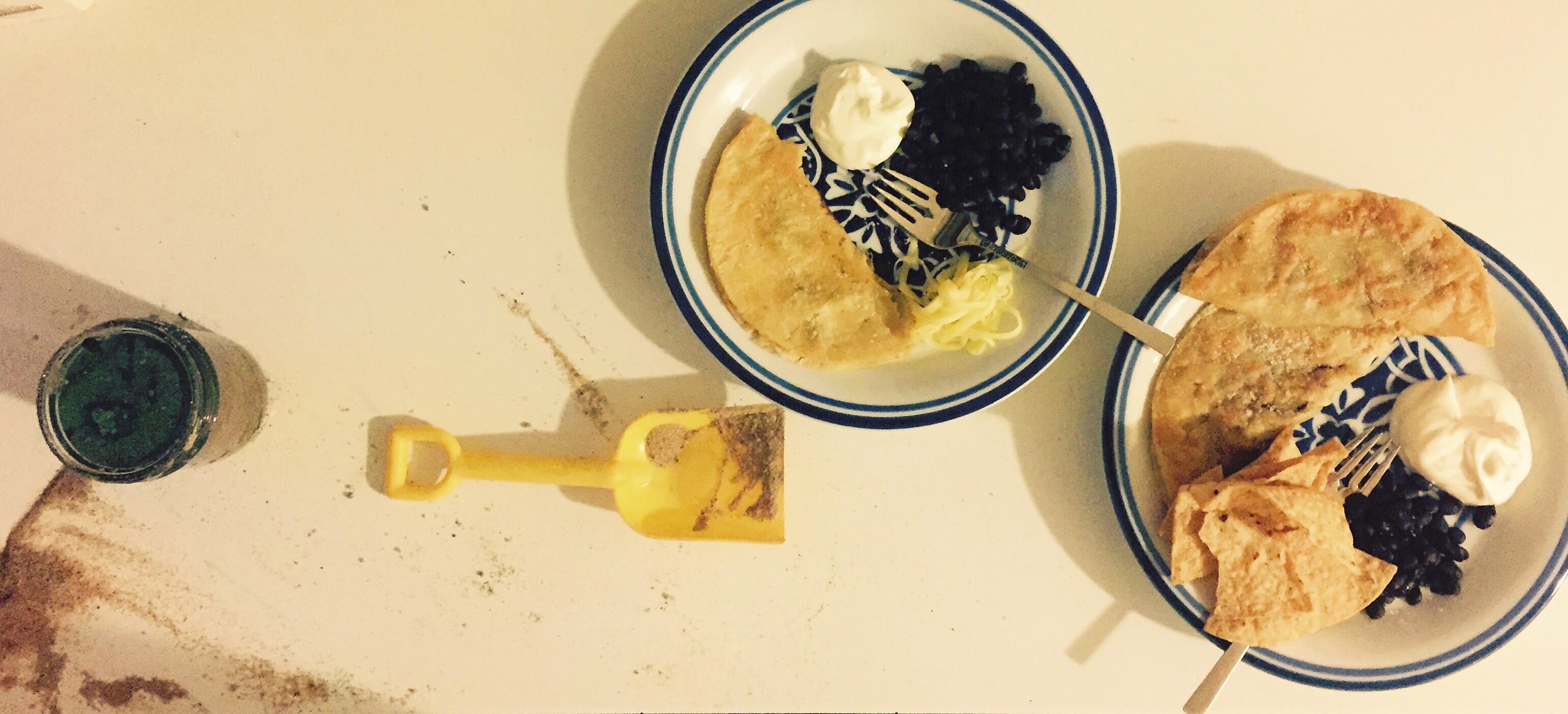 Quesadillas with Black Beans. I am hoping against hope that this will be the worst dinner shot I ever post here. We spent all day at the pumpkin patch in Marble Falls. The kids painted pumpkins and made sand art necklaces (George’s broke somewhere between the pumpkin patch and home and I didn’t notice until he had spilled purple sand all over the couch, through the house, and onto my lap at the dining room table, Henry’s has since broken and been patched up with hot glue). We rode a hay ride that took us through a decidedly creepy scarecrow village with as many offensive vignettes as the creator could think up. The first scene was a saloon complete with scarecrow prostitutes, legs wrapped suggestively around tree limbs. Another was a ‘No Girls Club’ with scarecrows wielding signs with colorful language about how shitty girls are. Towards the end there was a jail scene, with sad prisoner scarecrows locked up behind bars. This fed into a Despicable Me-themed scene with minions and Gru. The whole thing was so bizarre and so Texas- I loved it. My friend Molly came over for tea after we came home that afternoon, and I thought the boys would love to have a tea party too, so I set up their little Ikea set at the table with us, on a big lace tablecloth I bought at thriftland. But Henry was too jazzed about the sand art to drink tea. He had the idea to make his own colored sand by blending the filthy stuff from our sandbox out front with food dyes. So he did that next to us while we drank our tea, and eventually moved on to the technique you see above, where he mixed water and sand and food dye in glasses and left them all around the house. I chatted with Molly until after seven and then hastily made quesadillas with black beans for dinner.