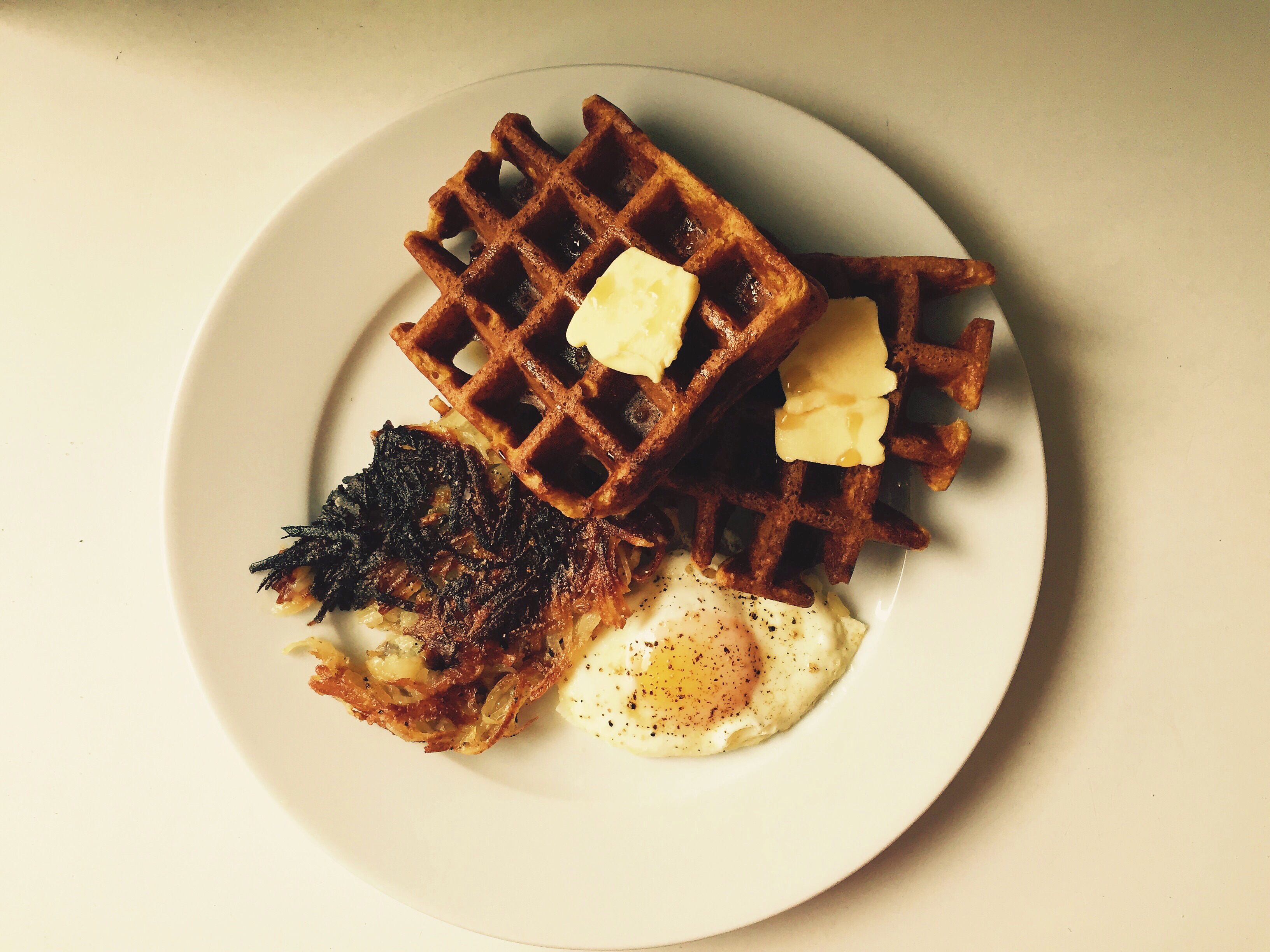Pumpkin Waffles, Hash Browns, Fried Egg. These hash browns look burnt in this picture, but I don’t think they were, really. They are incredible. I had never made hash browns because for some reason they didn’t sound all that appealing to me. But then I read the description of them in Make the Bread, Buy the Butter and had to try them. She describes them as ‘better than french fries’ and do you know what else? You brown the shredded potatoes in butter and then you pour 1/3 cup of cream on top of them before you flip them to brown the other side. What could be more compelling than that? Andy and I ate the whole pan, 1/2 a pound each. Henry ate 4 1/3 waffles, which is insane. They’re really good too, and were a great way to use up the last third of a can of pumpkin puree I had leftover after making those pumpkin chocolate chip muffins again this week. I know, it’s a problem. I can’t stop. The fried egg is there for health reasons. Protein and all that.