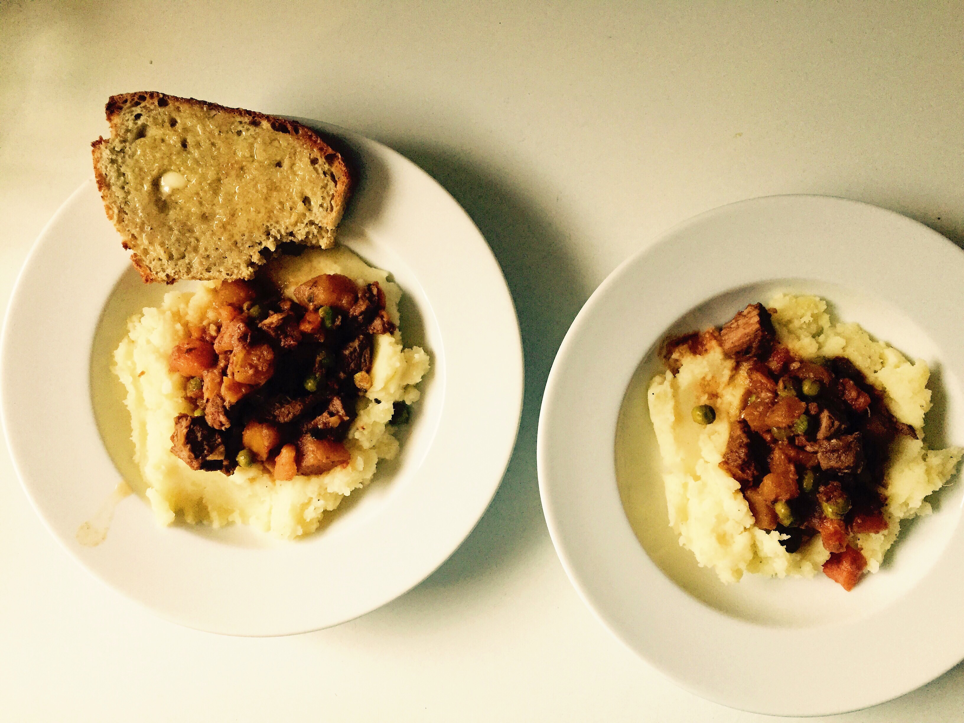 Everyday Bread. As you can see, I screwed this one up. The recipe is from Make the Bread, Buy the Butter, and it’s the easiest bread recipe I’ve ever read. You mix up the dough, divide it into two pans, let it rise for two-ish hours, and then bake it. You don’t knead it. I’ve made other no-knead breads before, but those have to sit around for half a day or more before you bake them. I didn’t know this sort of witchcraft, a no-knead bread with a short rise, was possible. You’re supposed to bake the bread in two loaf pans, but I’ve only got one left after losing two to mysterious circumstances, so I dumped the other half of the dough onto a sheet pan and roughly shaped it into a loaf. After 30 minutes of baking you’re meant to pop the bread out of the pans and return them to the oven for another 15 minutes or so. My loaf stuck horribly to the inside of the pan, and that’s why you see all its entrails exposed in this shot (still have Where the Red Fern Grows on the brain. Too soon?). In spite of my ham-fistedness, this bread still tastes pretty good! It’s moist, slices and toasts nicely, and tastes delicious with salted butter. George ate several slices of it, which is several slices more than any other kind of bread I’ve ever offered him. Still, I don’t know if it will become my everyday bread. It’s just a bit denser than I’d like.